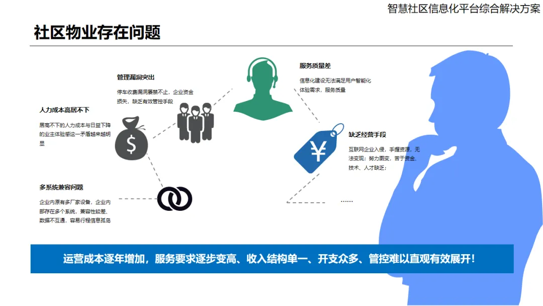 本方案针对社区物业劳动密集、信息化低、资源被侵、收支失衡、业主关系紧张等现状,以及多系统不兼容、经营手段缺乏、人力成本高、管理漏洞多等核心问题,围绕管理方 “降本增效提质”、用户 “安全便捷舒心” 的诉求,打造全维度智慧社区信息化解决方案,通过 “做好管理、提升服务、运营增值” 三步建设思路,实现社区业务流、数据流、资金流的统一管控。