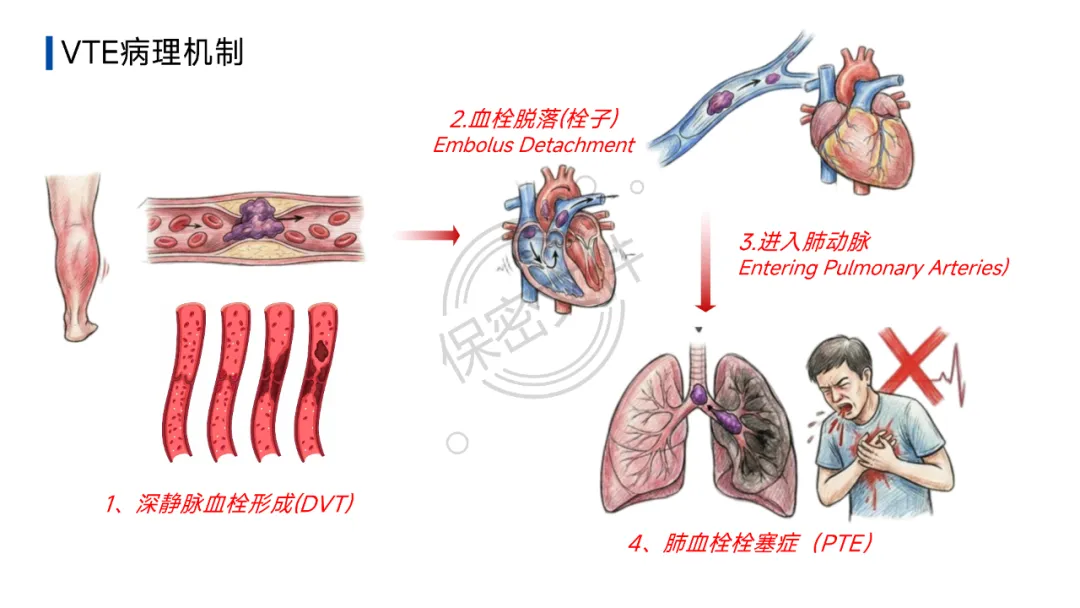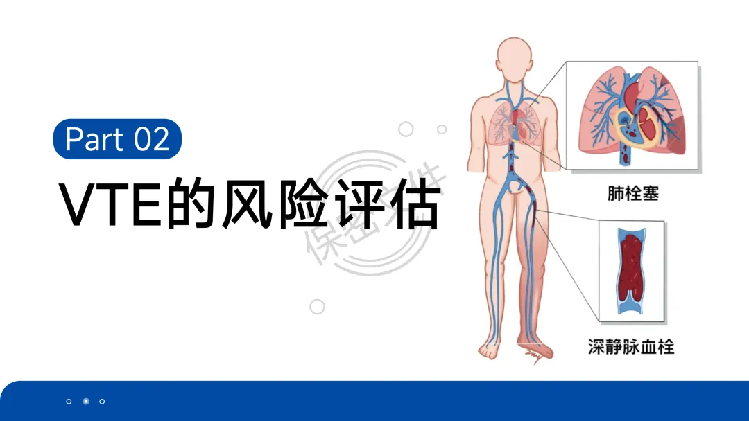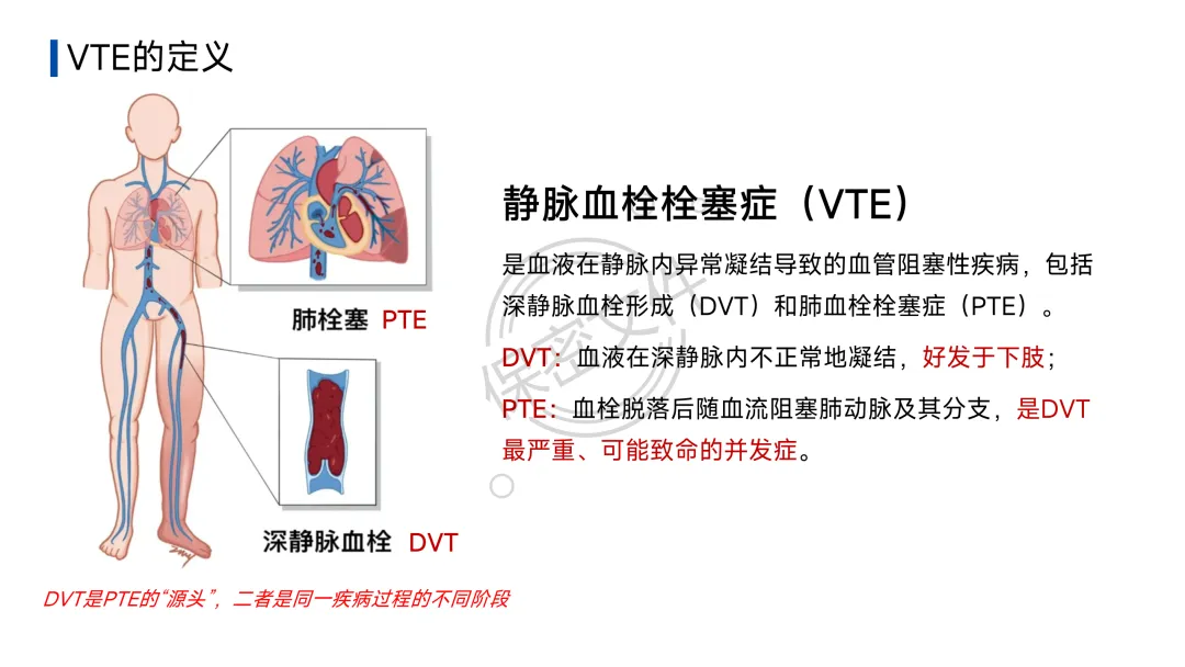 静脉血栓栓塞症(VTE)是血液在静脉内异常凝结导致的血管阻塞性疾病,是住院患者常见且可预防的致死原因。它包括: