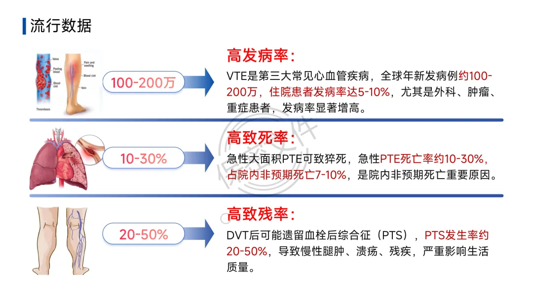 - 高发病率:是第三大常见心血管疾病,全球年新发病例约100-200万,住院患者发病率达5-10%,尤其是外科、肿瘤、重症患者,发病率显著增高