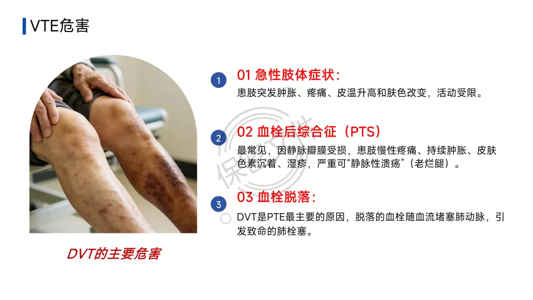 - 高致残率:DVT后可能遗留血栓后综合征(PTS),PTS发生率约20-50%,导致慢性腿肿、溃疡、残疾,严重影响生活质量。
