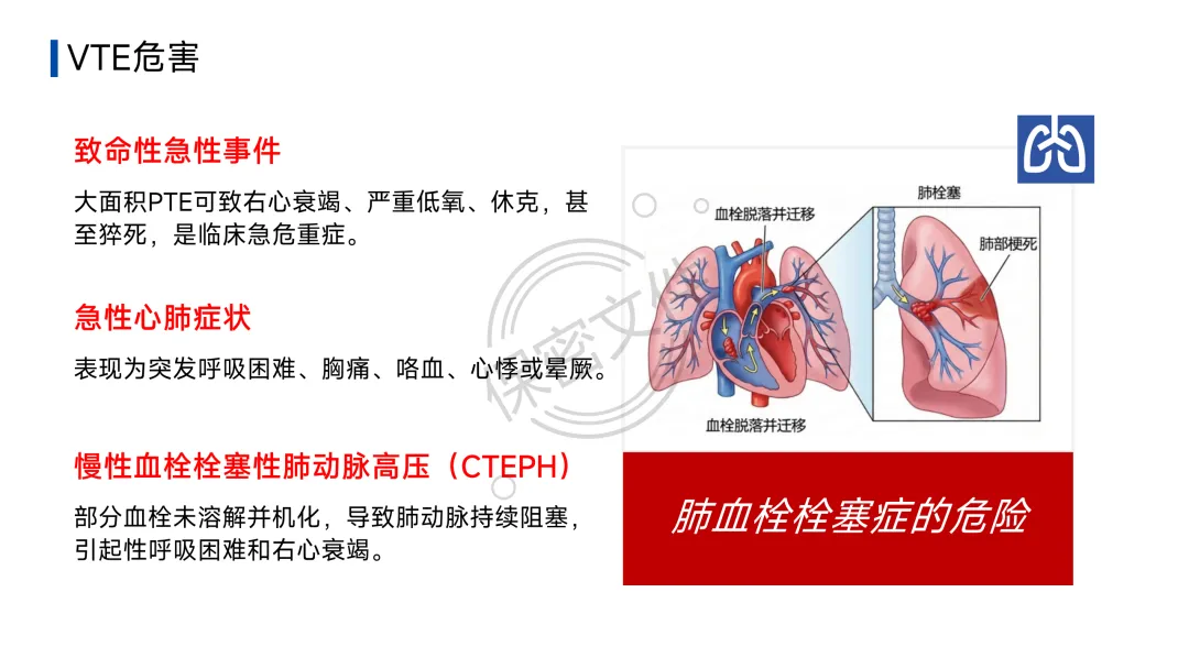 - 高致死率:急性大面积PTE可致猝死,急性PTE死亡率约10-30%,占院内非预期死亡7-10%。是院内非预期死亡的重要原因。