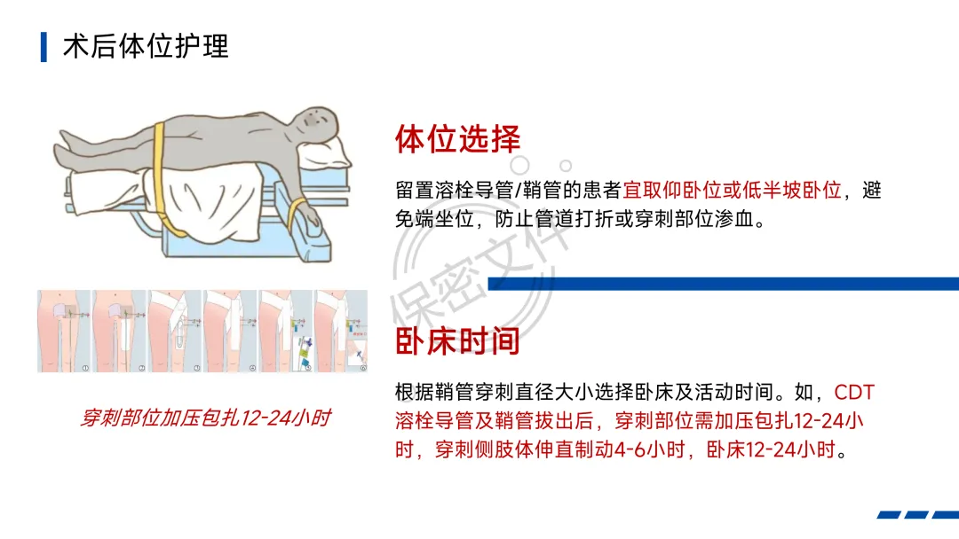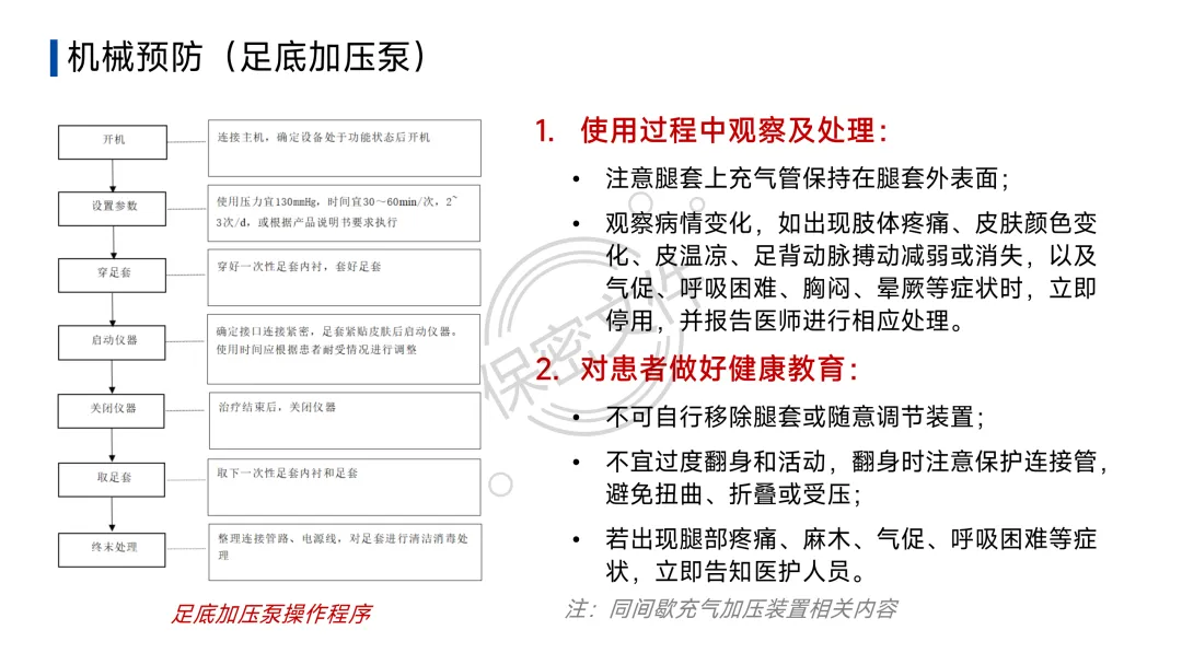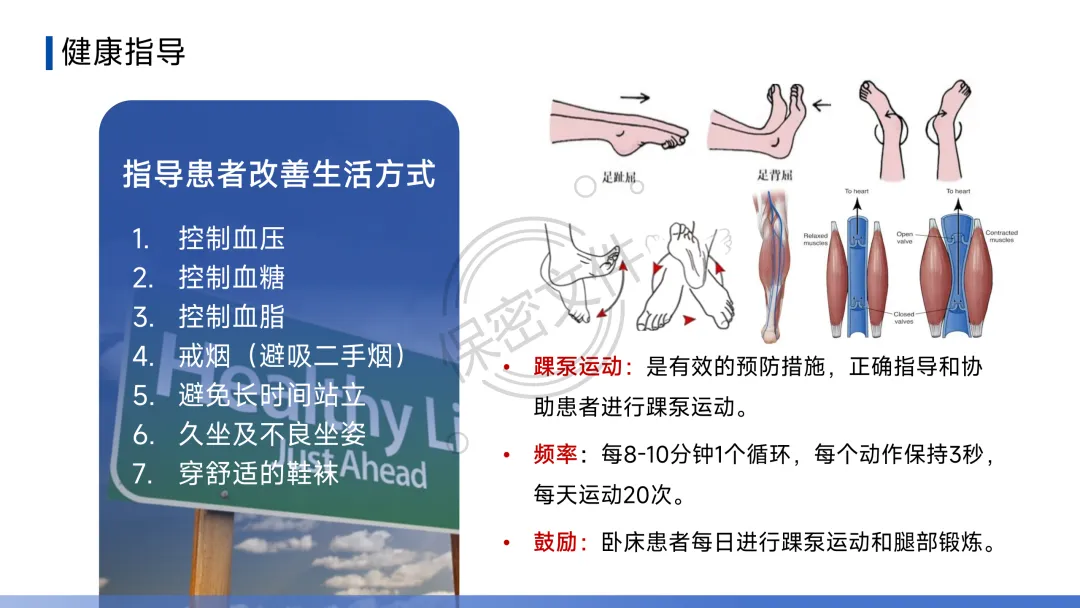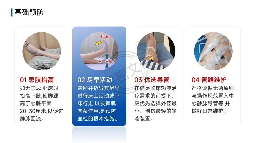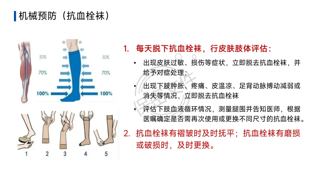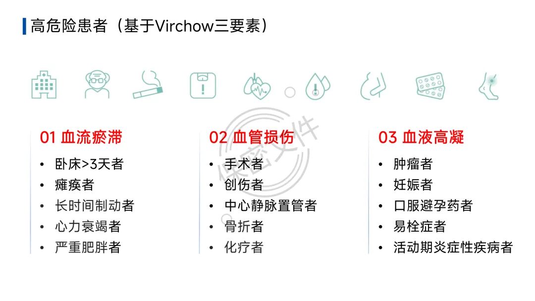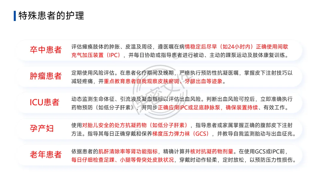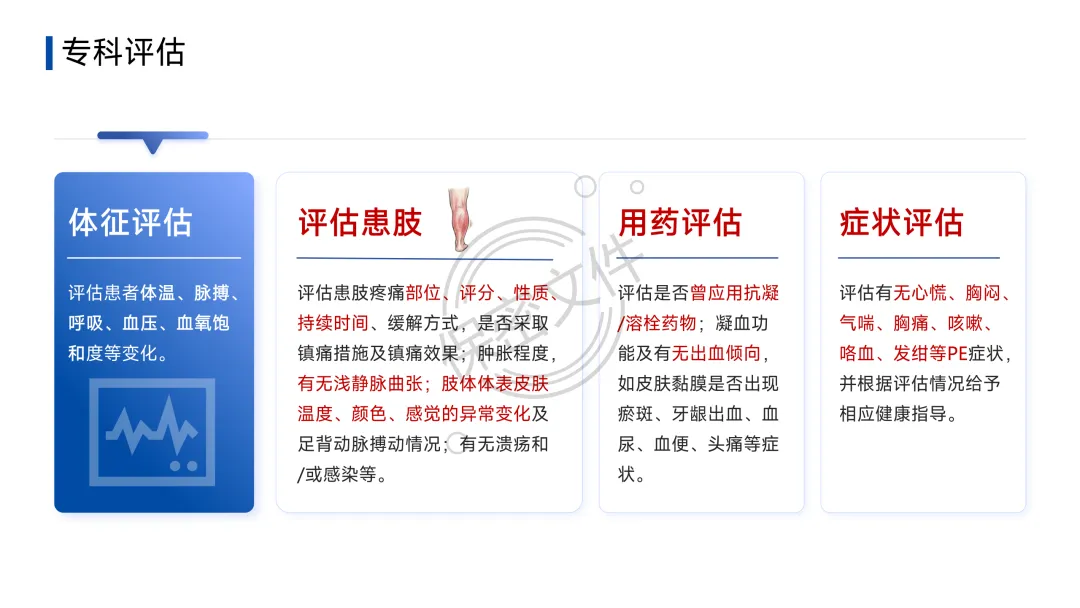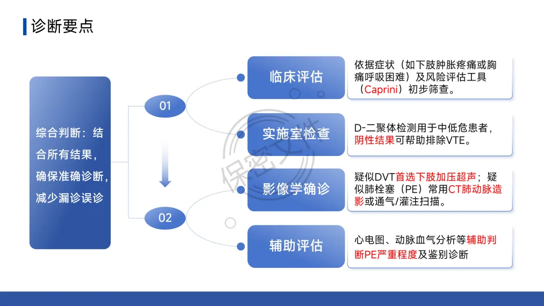 - 诊断流程:疑似DVT→下肢静脉超声;疑似PTE→临床可能性评估(Wells评分等)→D-二聚体初筛→CT肺动脉造影(CTPA)确诊。护理核心在于早期识别可疑症状并立即报告。