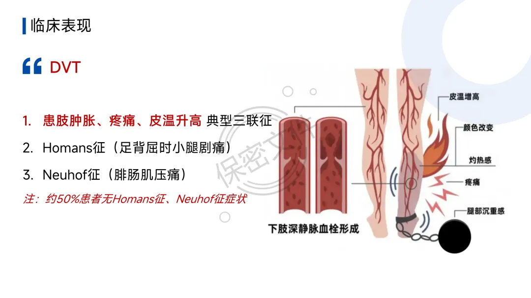- DVT:“患肢肿胀、疼痛、皮温升高”是典型三联征。查体关注Homans征(足背屈时小腿剧痛)和Neuhof征(腓肠肌压痛)。但约50%患者无症状。
