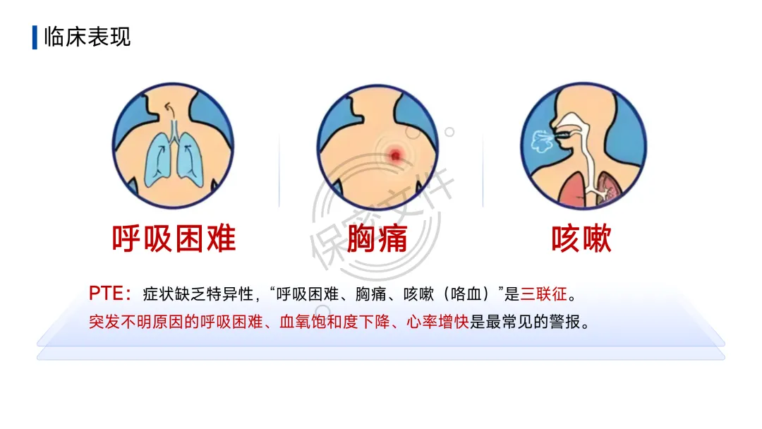 - PTE:症状缺乏特异性。“呼吸困难、胸痛、咯血”三联征仅见于不足30%患者。突发不明原因的呼吸困难、血氧饱和度下降、心率增快是最常见的警报。