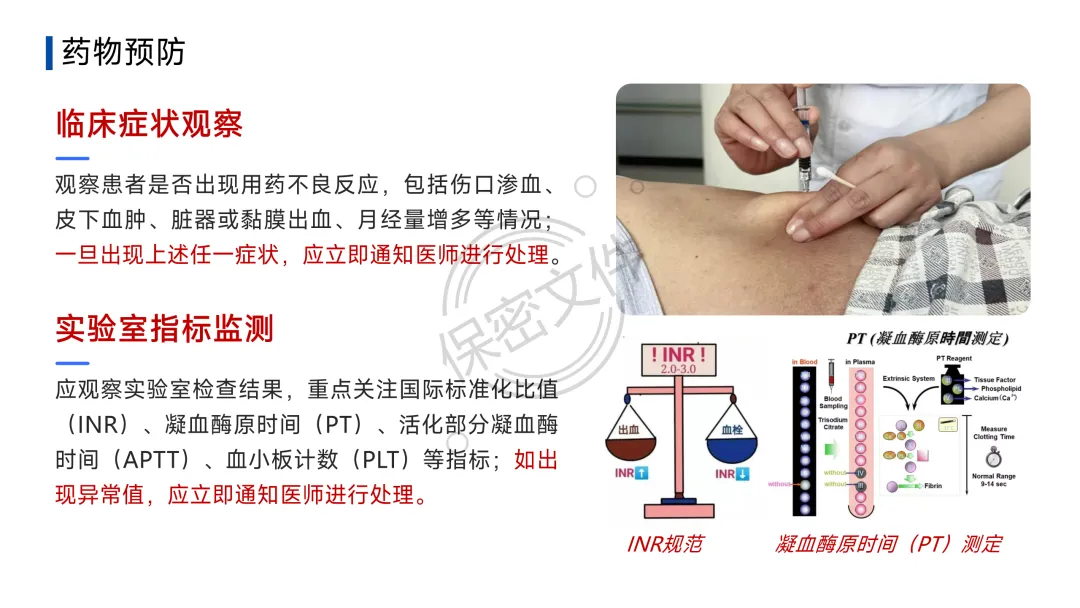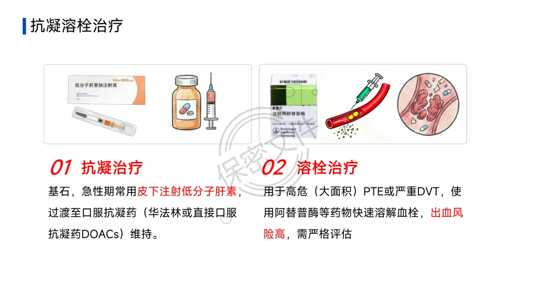 - 溶栓治疗:用于高危(大面积)PTE或严重DVT。