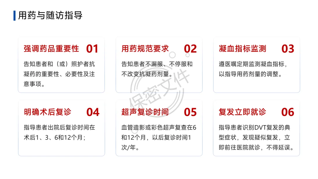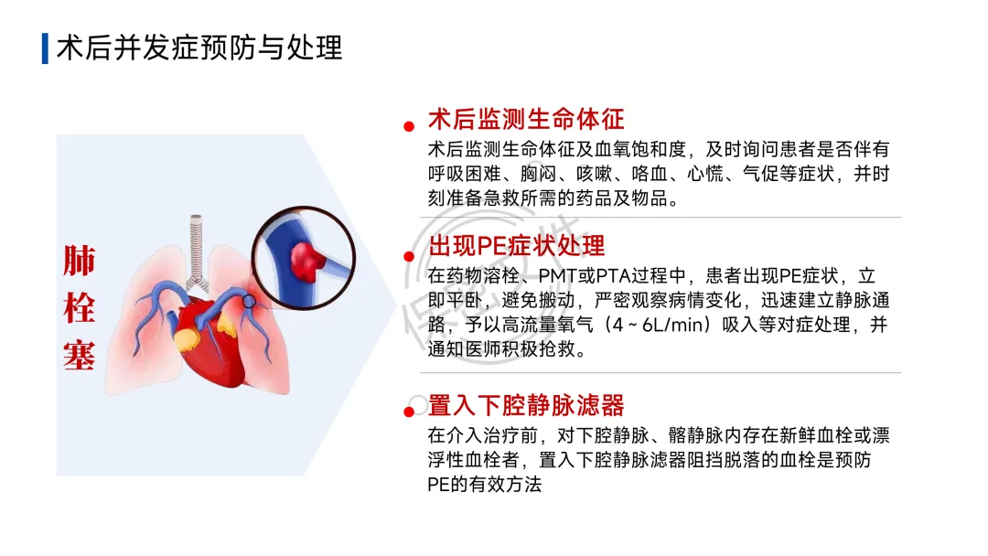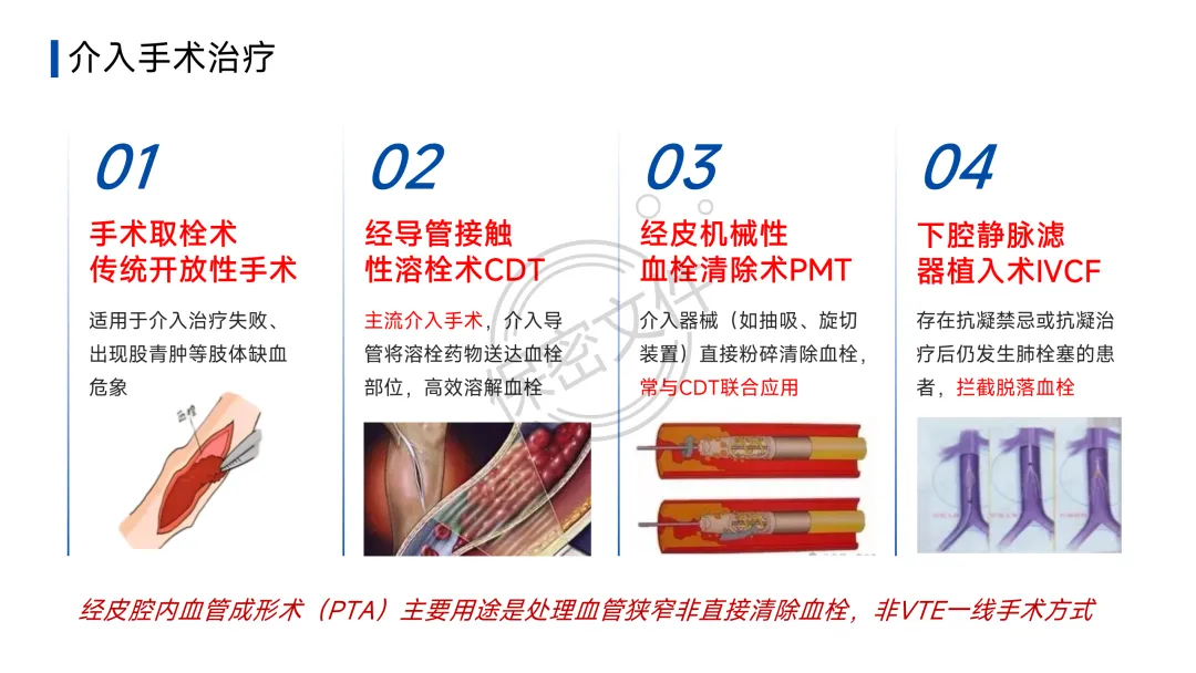 - 介入/手术:导管取栓、碎栓,或置入下腔静脉滤器(IVCF)(用于有抗凝禁忌者)。