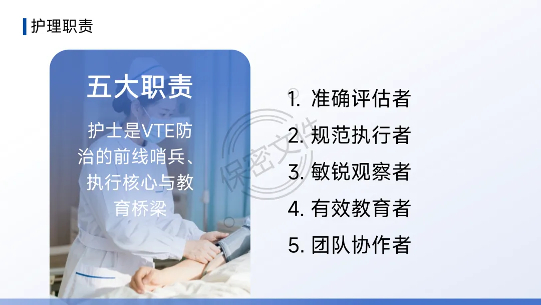 护士是VTE防治的前线哨兵、执行核心与教育桥梁。五大职责:准确评估者、规范执行者、敏锐观察者、有效教育者、团队协作者。
