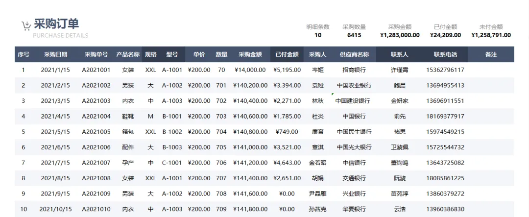 今天分享一套Excel采购订单管理系统,自带函数公式,基础数据填入表格后,自动计算,录入订单后自动汇总各供应商金额,交期进度一列看清,未到货订单一键筛出,月底汇报数据直接读表,不用再现场翻、现场算,使用起来超级方便!