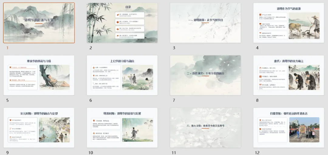 接下来,我们进入第二部分,历史演变:千年习俗的融合。在数千年的历史长河中,清明节的习俗不断融合、定型,不同朝代赋予了它不同的发展印记,最终形成了我们如今熟知的节日形态。