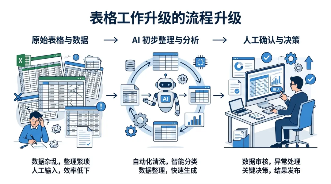 这类能力最值得关注的,不是它会不会取代 Excel,而是它会不会让表格工作从"纯手工"变成"先让 AI 起草,再由人确认"。