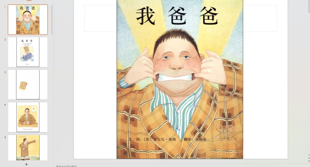 《我爸爸》是一本很温馨的绘本,本书用温馨的画面,温暖的表现手法,讲述了小安东尼的爸爸是怎样的一个爸爸。他会唱歌、会跳舞、可以赶走坏蛋大野狼、能够跳过月亮。最重要的是,他很爱他的爸爸,他的爸爸也深深的爱着他。这本书从不同的角度描述了爸爸的本领,树立了一个高大的父亲形象。故事里描述爸爸时都是非常生动的,让孩子一目了然。故事里无论爸爸是什么样的,他始终穿着那件衣服,给孩子非常亲切的感觉。爸爸也许没有什么时间陪着孩子,可是爸爸也是永远爱着孩子的,这一点一定要告诉孩子哦!《我爸爸》绘本PPT截图