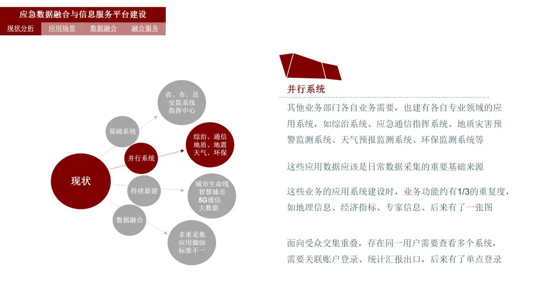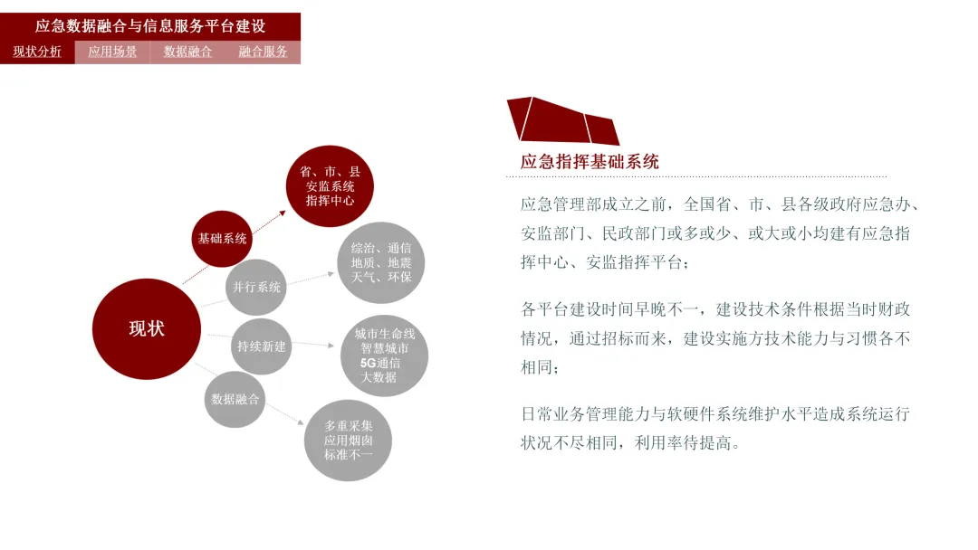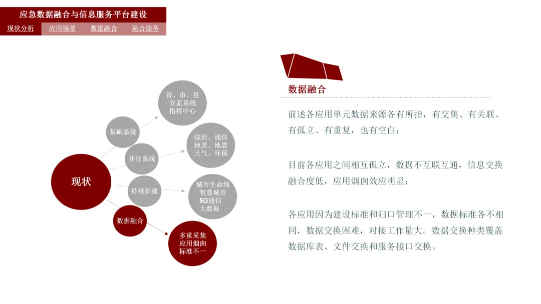 你是否见过这样的场景:应急指挥时,各部门系统数据不通,信息像一座座孤岛;重复采集数据耗时耗力,标准不统一让对接工作难上加难;灾害来临,想要快速调取资源、做出决策,却被零散的信息绊住脚步。在城市智能化发展的当下,应急管理的信息化升级早已迫在眉睫,而智慧应急数据融合及信息服务平台的建设,正是破解这些痛点的关键。这篇内容,就带大家拆解这份应急平台建设方案的核心,看看如何通过数据融合,让应急管理更高效、更智能。 当自然灾害、安全事故不期而至时,是什么让我们的城市能够迅速响应,化险为夷?今天,就让我们一起揭开智慧应急数据融合及信息服务平台的神秘面纱,看看这座城市背后的“智慧大脑”是如何运作的。一、应急新挑战:数据孤岛与信息壁垒