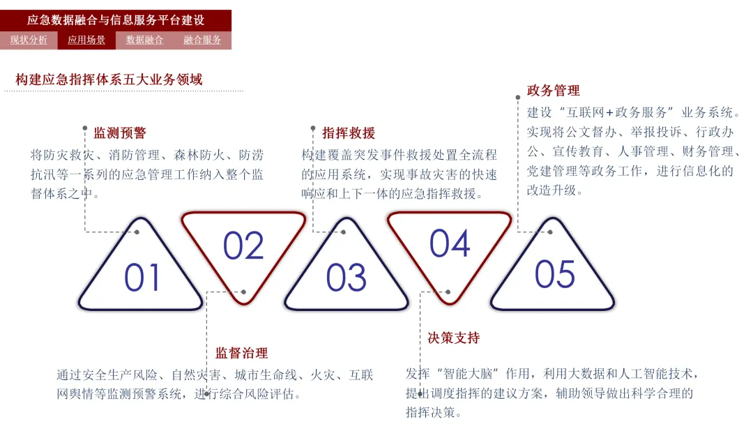智慧应急数据融合及信息服务平台不仅仅是一个数据汇聚与共享的平台,更是一个集监测预警、监督治理、指挥救援、决策支持、政务管理五大业务领域于一体的综合应急管理体系。