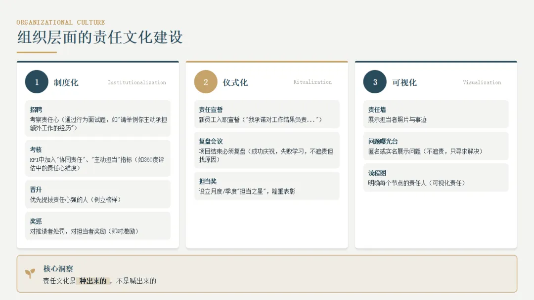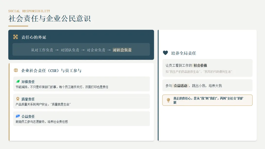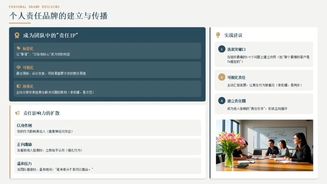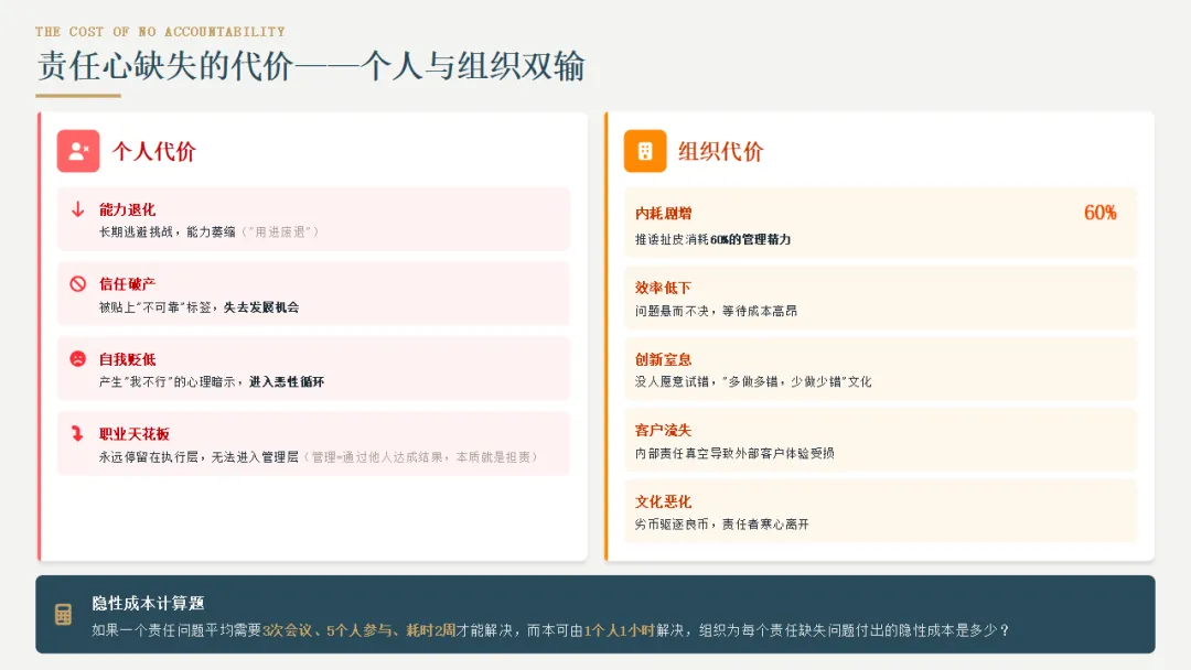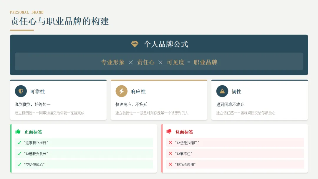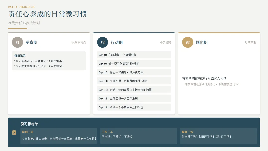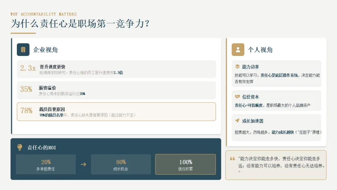 从企业视角看,责任心是最划算的投资。你多承担20%的责任,可能获得80%的成长机会,积累100%的信任资本。这是一个指数级的投资回报率。