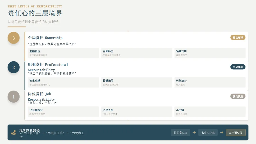 境界跃迁的路径是:从"为工资工作"(打工者心态)→ 到"为成长工作"(合伙人心态)→ 到"为使命工作"(主人翁心态)。