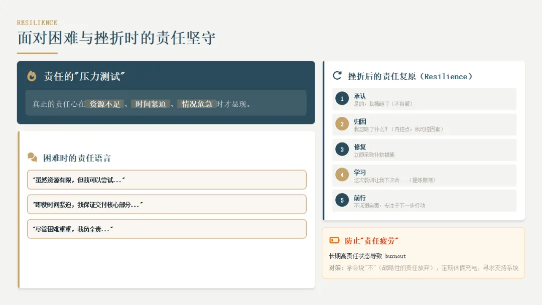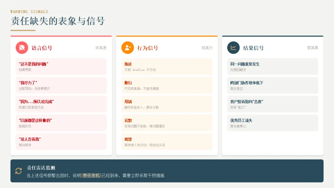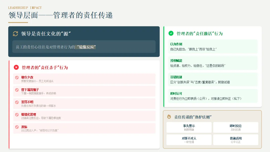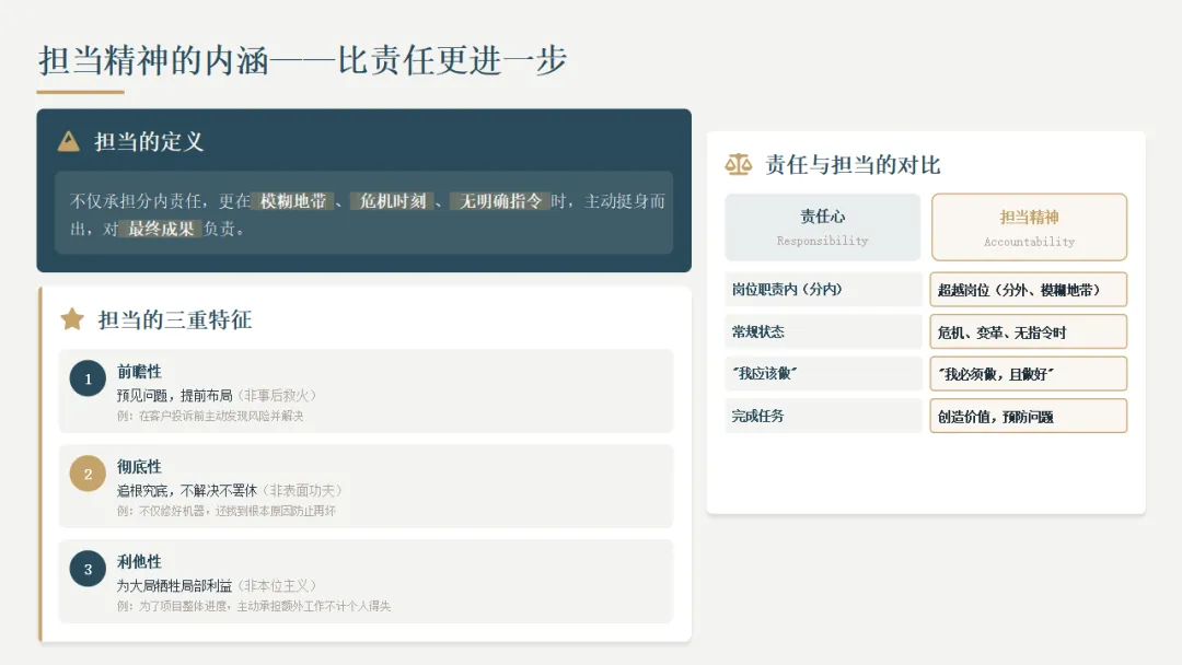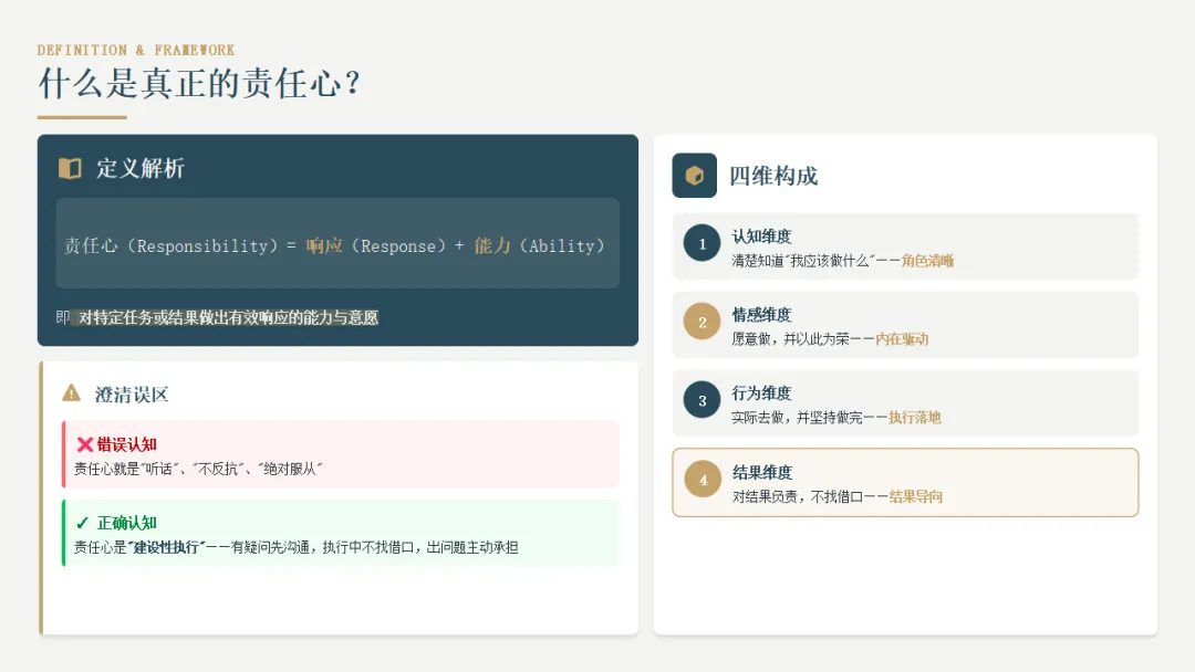那是奴性,不是责任。真正的责任心是"建设性执行"——有疑问先沟通,执行中不找借口,出问题主动承担。
