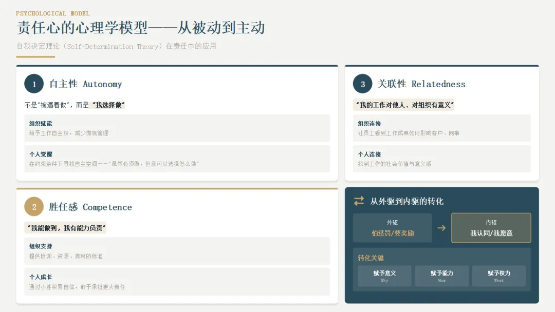 从外驱到内驱的转化,关键在于赋予意义(Why)、赋予能力(How)、赋予权力(What)。当这三个条件满足,外在的责任要求就转化为内在的责任自觉。