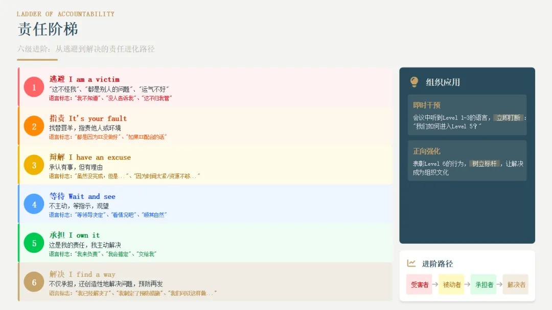 我给大家介绍一个非常实用的工具,叫"责任阶梯"(Ladder of Accountability),它描述了六级责任进化路径: