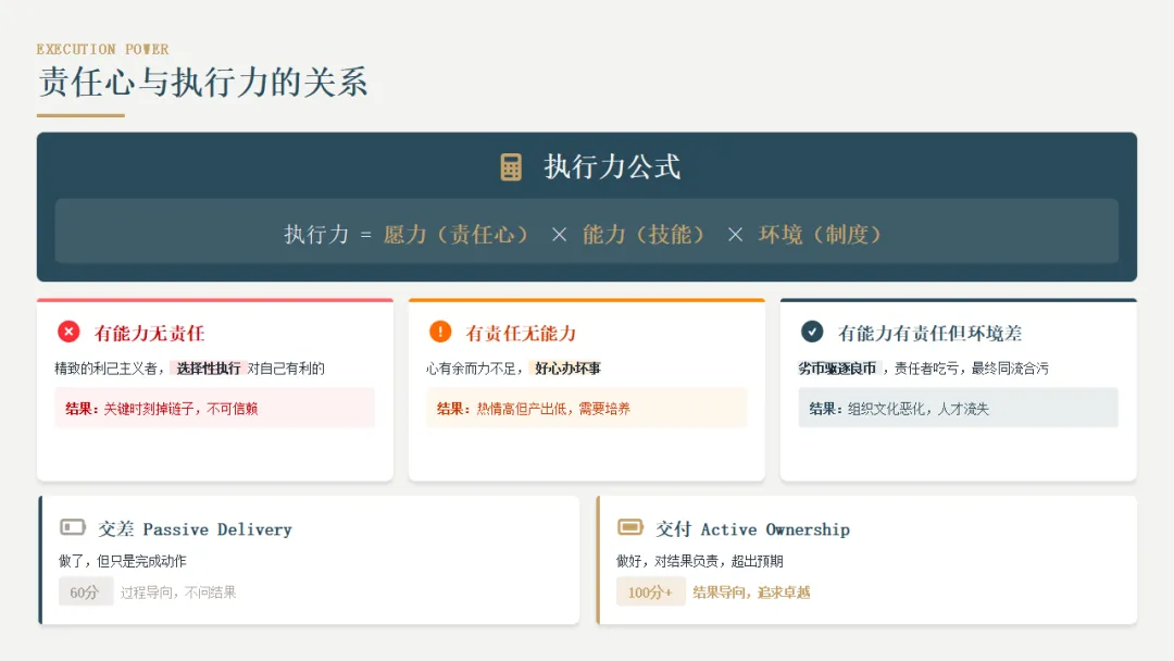 执行力 = 愿力(责任心) × 能力(技能) × 环境(制度)。