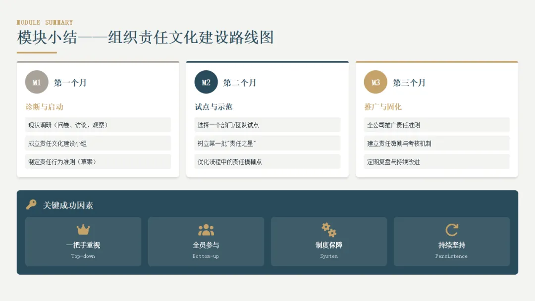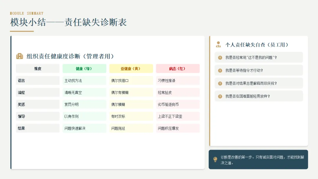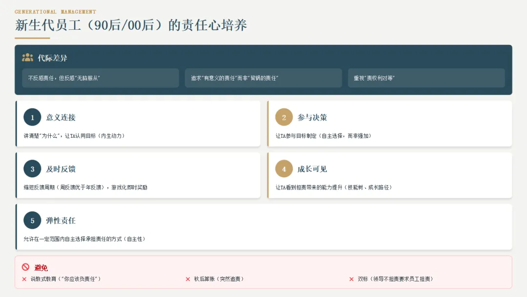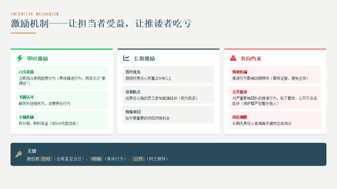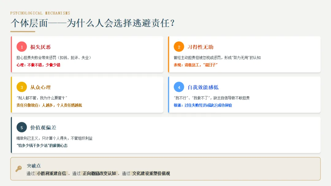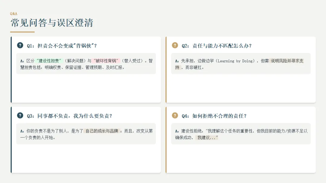"我能做到,我有能力负责"。通过小胜积累自信,敢于承担更大责任。如果你总是觉得自己不行,你就不敢担责。组织要提供培训和支持,个人要通过小成功建立自信。