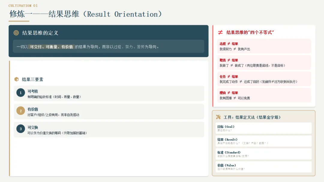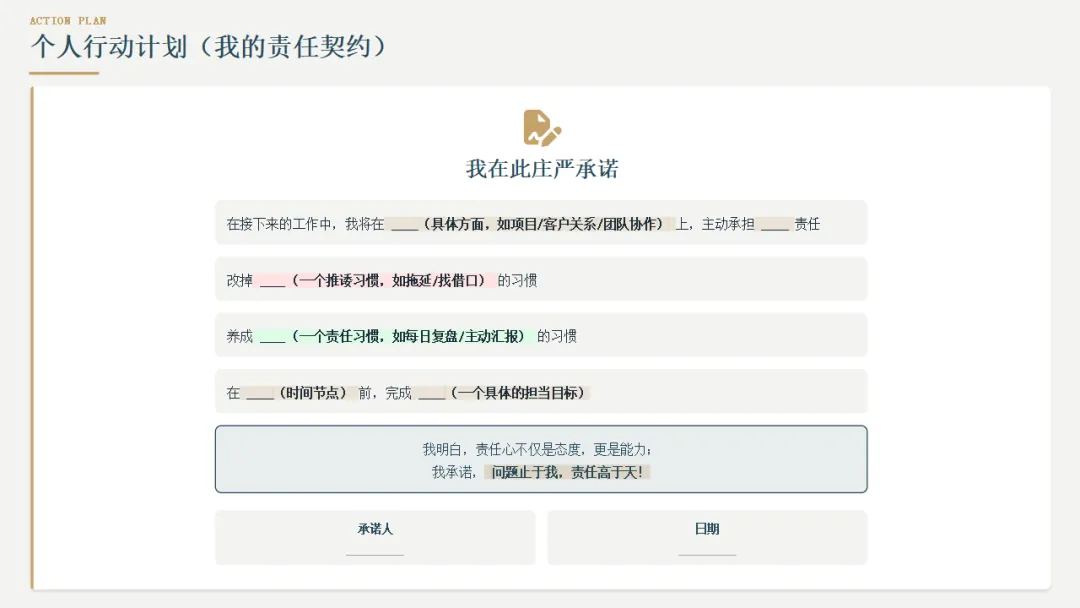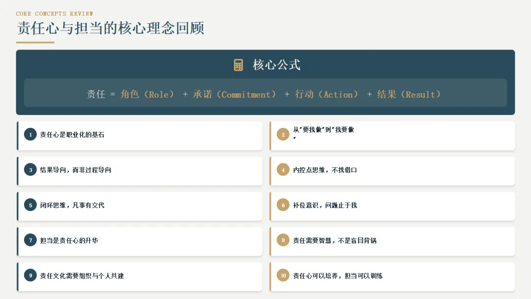 对结果负责,不找借口,结果导向。过程重要,但结果才是检验责任心的唯一标准。