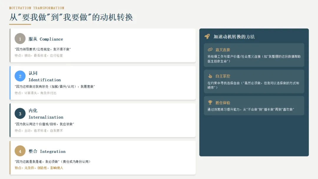不是"被逼着做",而是"我选择做"。即使在被约束的条件下,你也要寻找自主空间。比如,"虽然这个任务我必须做,但我可以选择怎么做,用什么方法做,什么节奏做。" 组织要给予自主权,减少微观管理;个人要在约束条件下寻找自主空间。