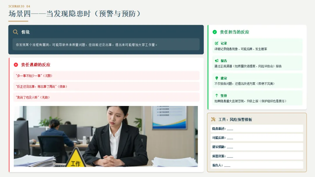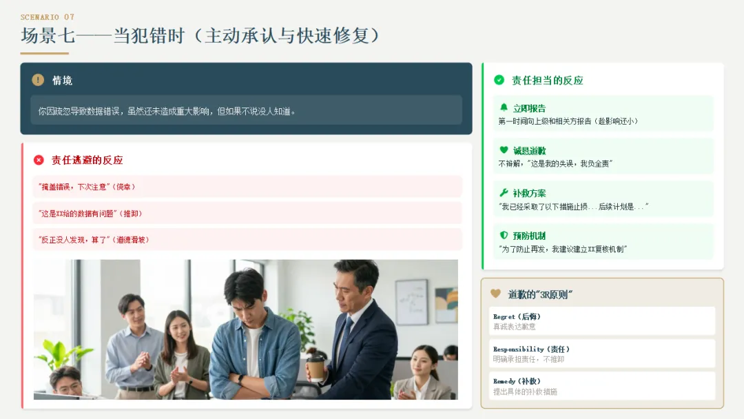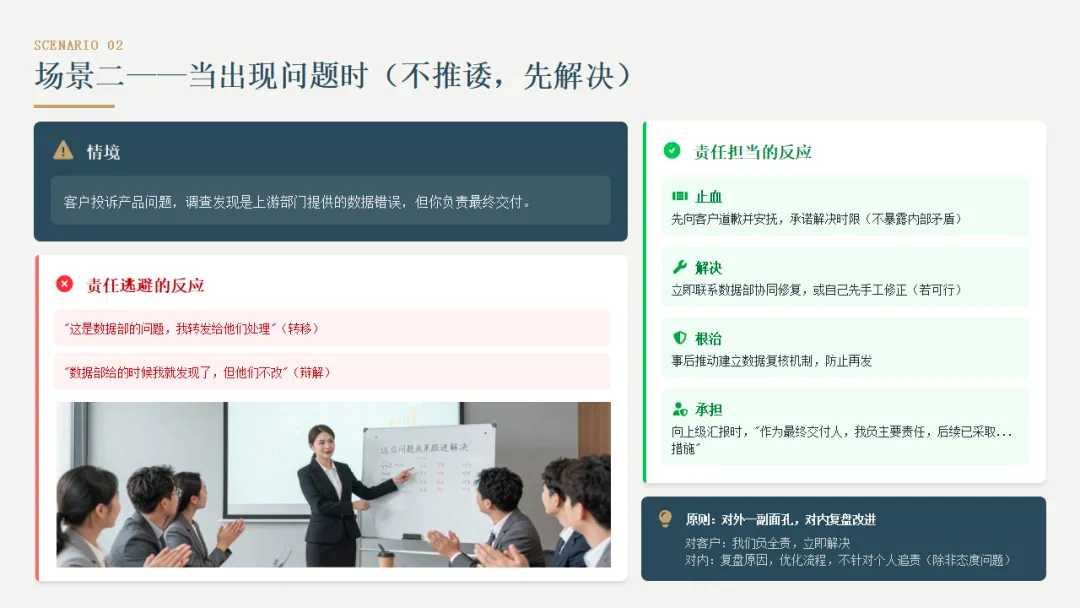 不仅承担,还创造性地解决问题,预防再发。"我已经解决了"、"我制定了预防措施"、"我们可以这样做..."