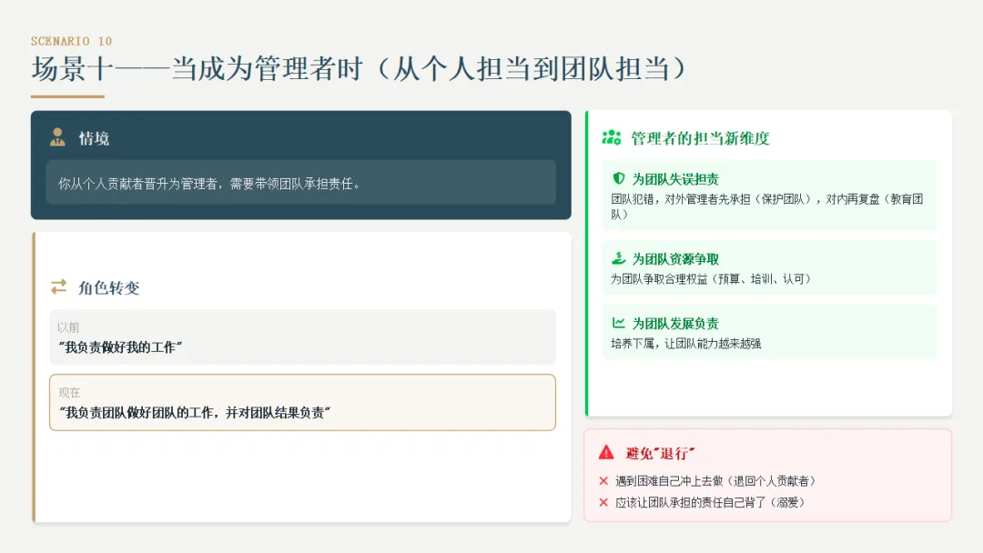 这是分水岭。语言标志:"我来负责"、"我会搞定"、"交给我"。这是责任心的起点。