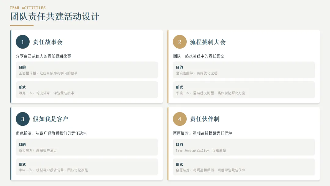 "我的工作对他人、对组织有意义"。找到工作的社会价值与意义感。为什么清洁工也有责任心?因为他们知道干净的環境对大家的健康很重要。让员工看到工作成果如何影响客户、同事,是激发责任心的关键。