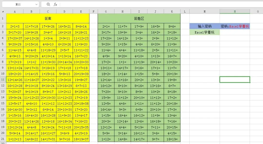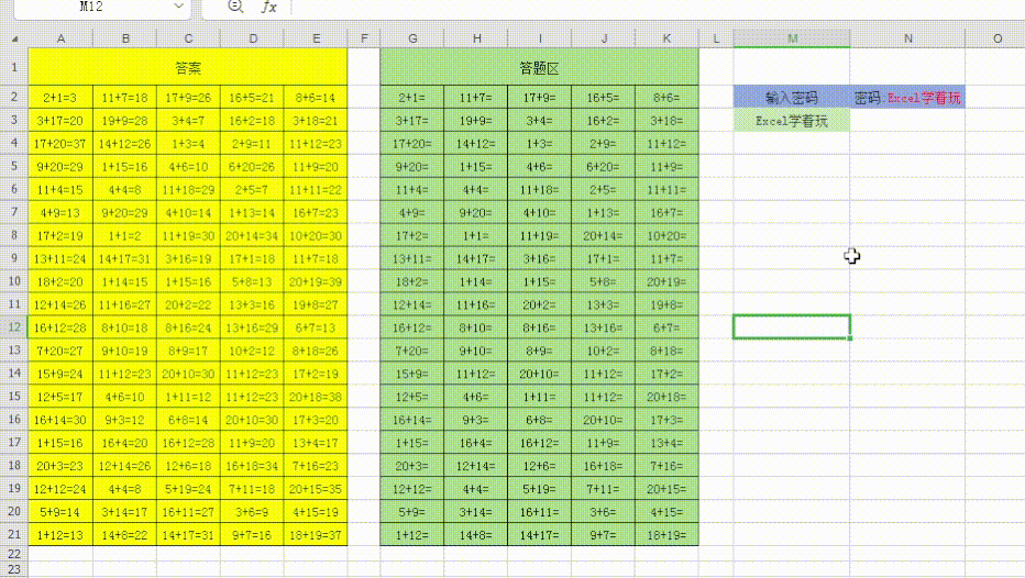 小伙们,今天来一个条件格式小实例,也是一个小技巧吧!就是有朋友需要一个制作一个简单的20以内的数学加法算式,分两个区域显示,第1个区域显示完整的算式和答案,第2个区域显示算式,输入密码可以显示答案,否则不显示答案,方便小学生算完后验证。=RANDBETWEEN(1,20)&"+"&RANDBETWEEN(1,20)&"="RANDBETWEEN函数亮个参数,可以产生第1个参数和第2个参数之间的随机数。然后用公式产生算式。=G2&EVALUATE(SUBSTITUTE(G2,"=",))EVALUATE函数可以将算式形成结果(好像只有WPS里面有这个函数),需要先用SUBSTITUTE函数将答题区的=号去掉。先将公式里面的计算选项自动改为手动,然后将答题区和答案区的公式复制粘贴为值。输入=$M$3="Excel学着玩",然后设置格式,底色填充为黄色,字体设置为黑色。确定。输入=$M$3<>"Excel学着玩",然后设置格式,底色填充为无,字体设置为白色。确定。输入密码“Excel学着玩”显示答案区,否则显示空白(其实还有数据,只不过是字体颜色是白色,看不见而已)。好了,今天就聊到这,今天分享的小技巧也很简单,很容易掌握,平时我们在工作中也经常用到,小伙伴们要多加练习,熟练掌握他的用法和需要注意的事项。有什么不懂的地方,或在工作中遇到的实际问题,打到评论区,让我们一起搞定他!
