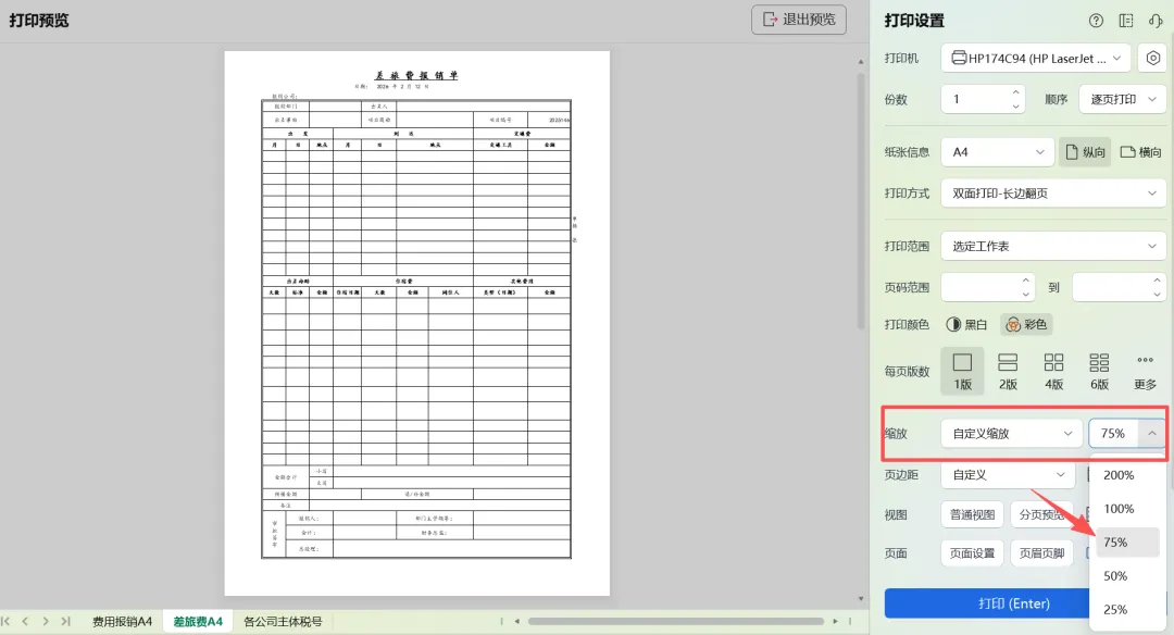 ,调整至自己想要的样式,退出打印预览打印即可。