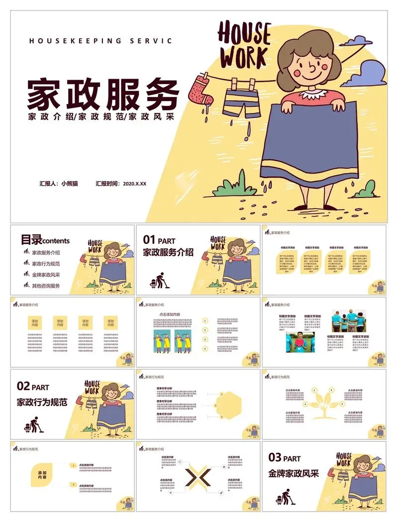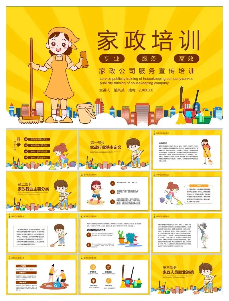 内含家政服务培训通用模板、家政服务宣传推广模板、月嫂专业技能培训模板等,内容全面、实用性强,可直接编辑使用。