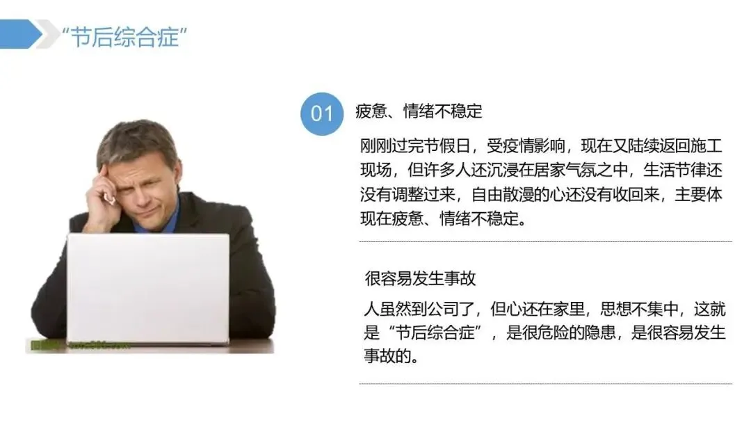 - 深入剖析员工节后常见的疲惫、情绪不稳定、注意力不集中等状态,并将其定性为重大安全隐患。