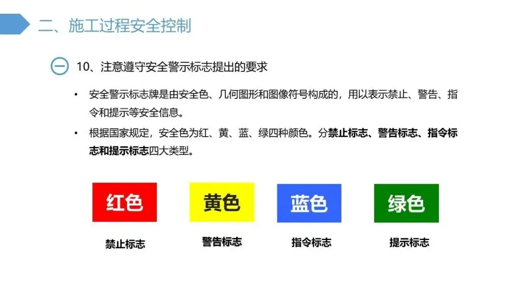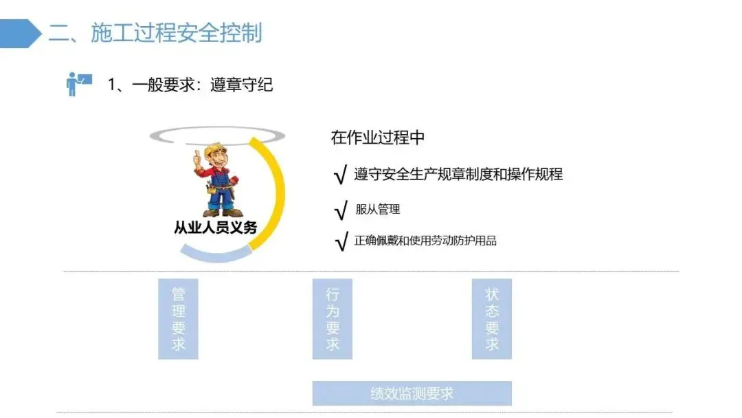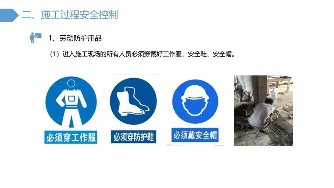 - 施工中:提出十大具体控制措施,包括全员遵守劳动纪律、严格执行“零容忍”条款(如高处作业必须系安全带)、规范高处/临时用电/动火/受限空间等高危作业、落实“三不伤害”原则、遵守安全警示标志等。