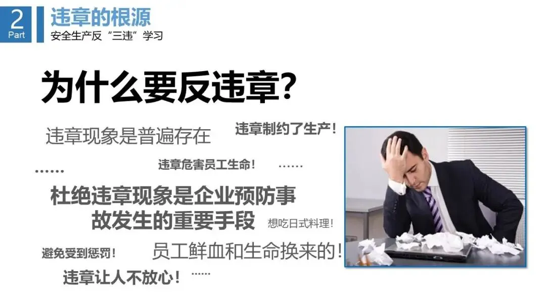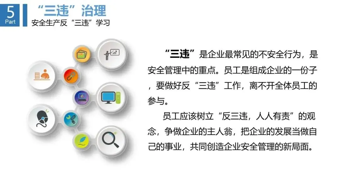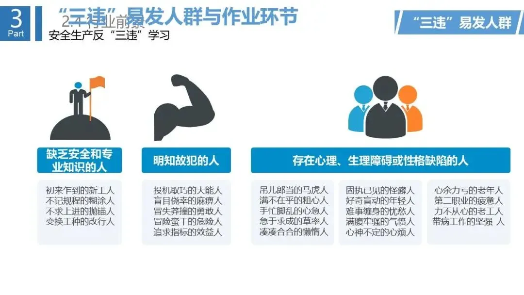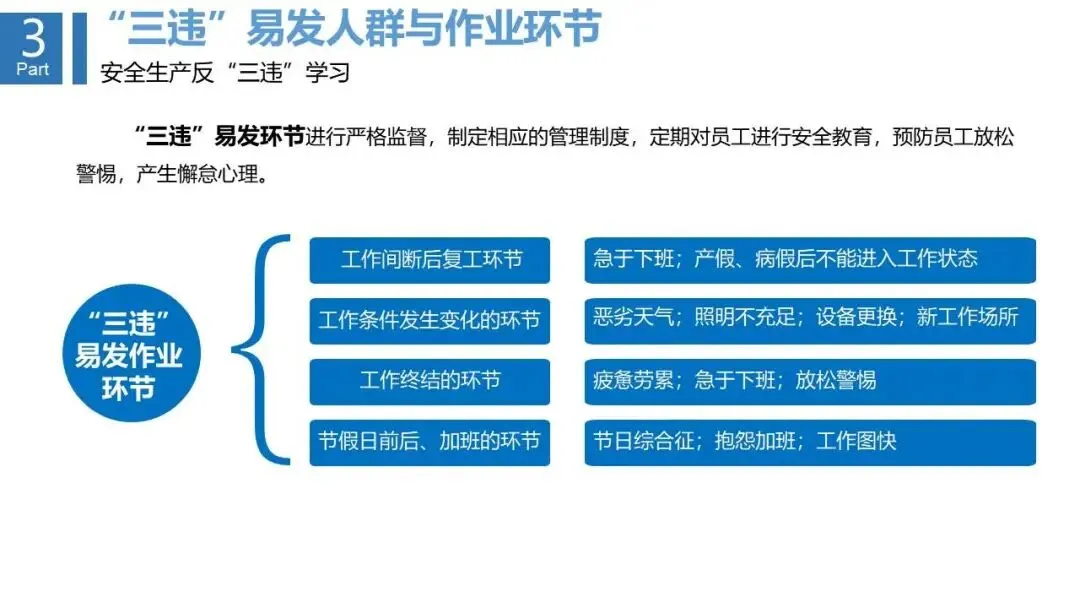 - 分析了“三违”的顽固性、传染性等特征,并指出了易发人群与作业环节。