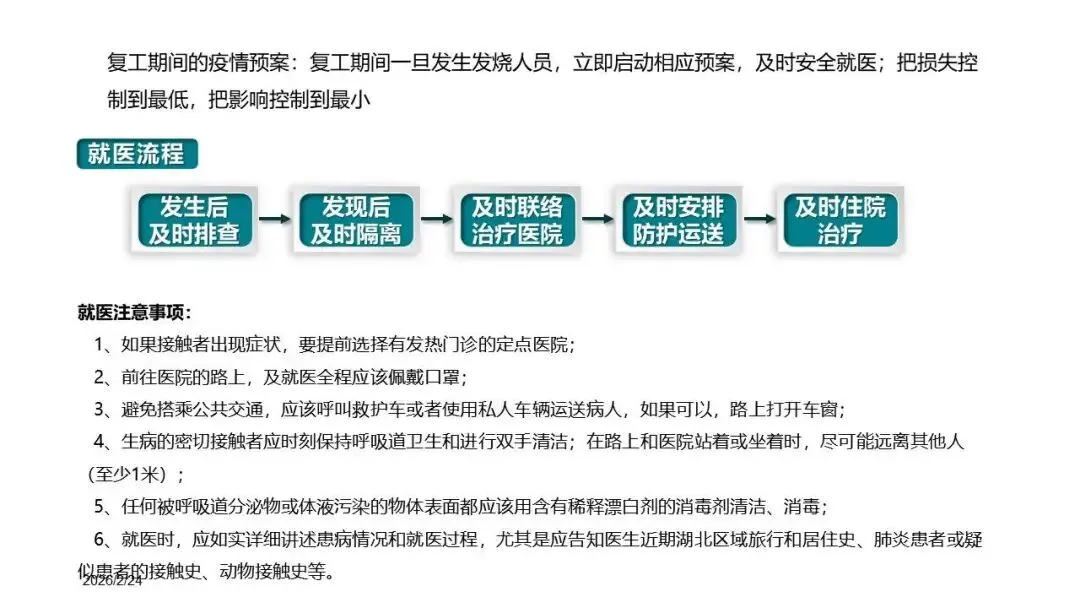 - 强调应急预案的重要性,并简述了复工期间的疫情应急处置流程。