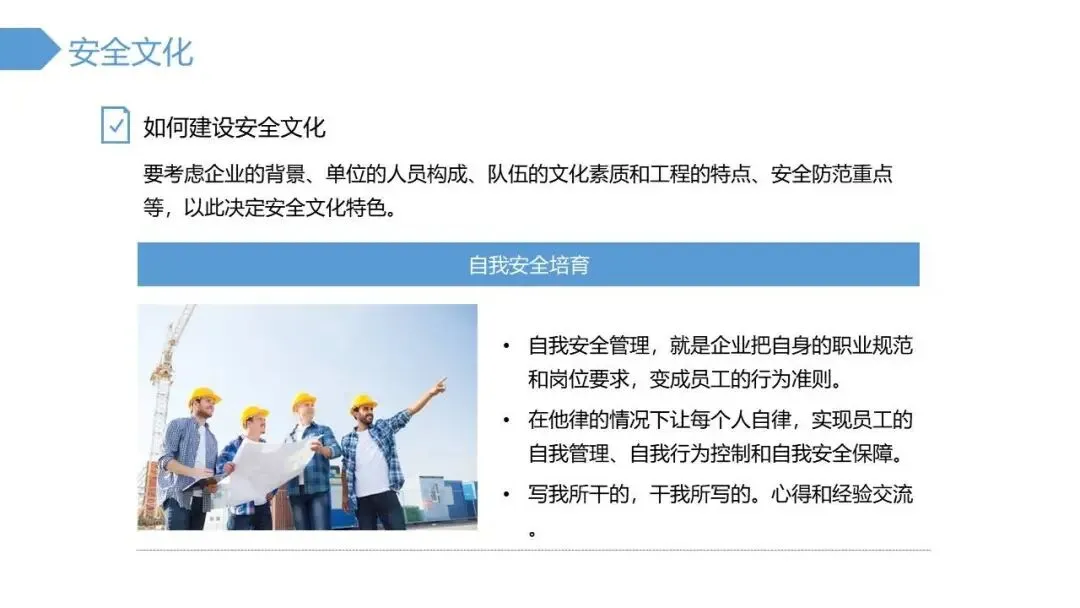 - 以安全文化收尾,通过故事和理念倡导从“要我安全”到“我要安全”的转变,最终落脚于“所有的事故都是可以控制的”这一核心信念。