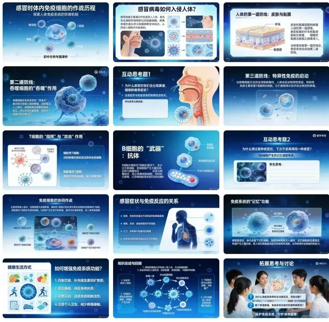 提示词:制作15页初中生生物课件,主题为"感冒时体内免疫细胞的作战历程",高信息密度,含病毒入侵及吞噬细胞、T细胞、B细胞等免疫细胞的反应机制,配相关示意图与互动思考题