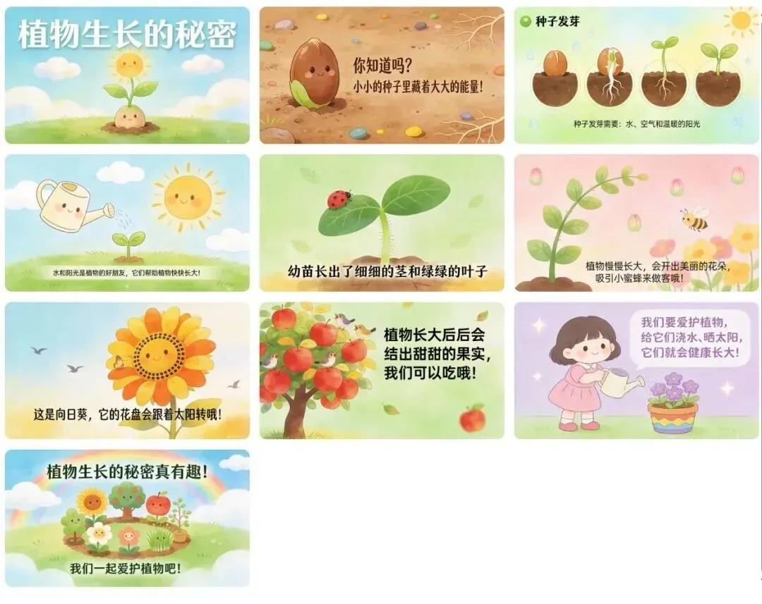 提示词:帮我制作一个儿童绘本风格的PPT,主题是"植物生长的秘密",一共生成10页内容,色彩温暖治愈