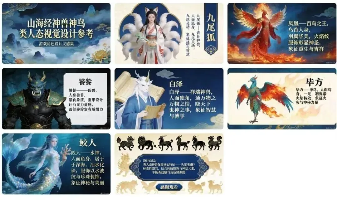 提示词:我是一名游戏设计师,需要一些山海经传说的神兽神鸟设定,请帮我制作一个"山海经神话中的神兽神鸟"的视觉参考PPT,所有神兽神鸟都是类人态设计,又有本体的特点