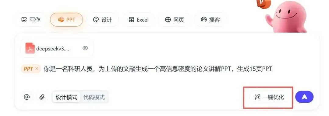 论文、报告、手册……上传给它,它就能快速消化,自动提炼重点,做成结构清晰的PPT。