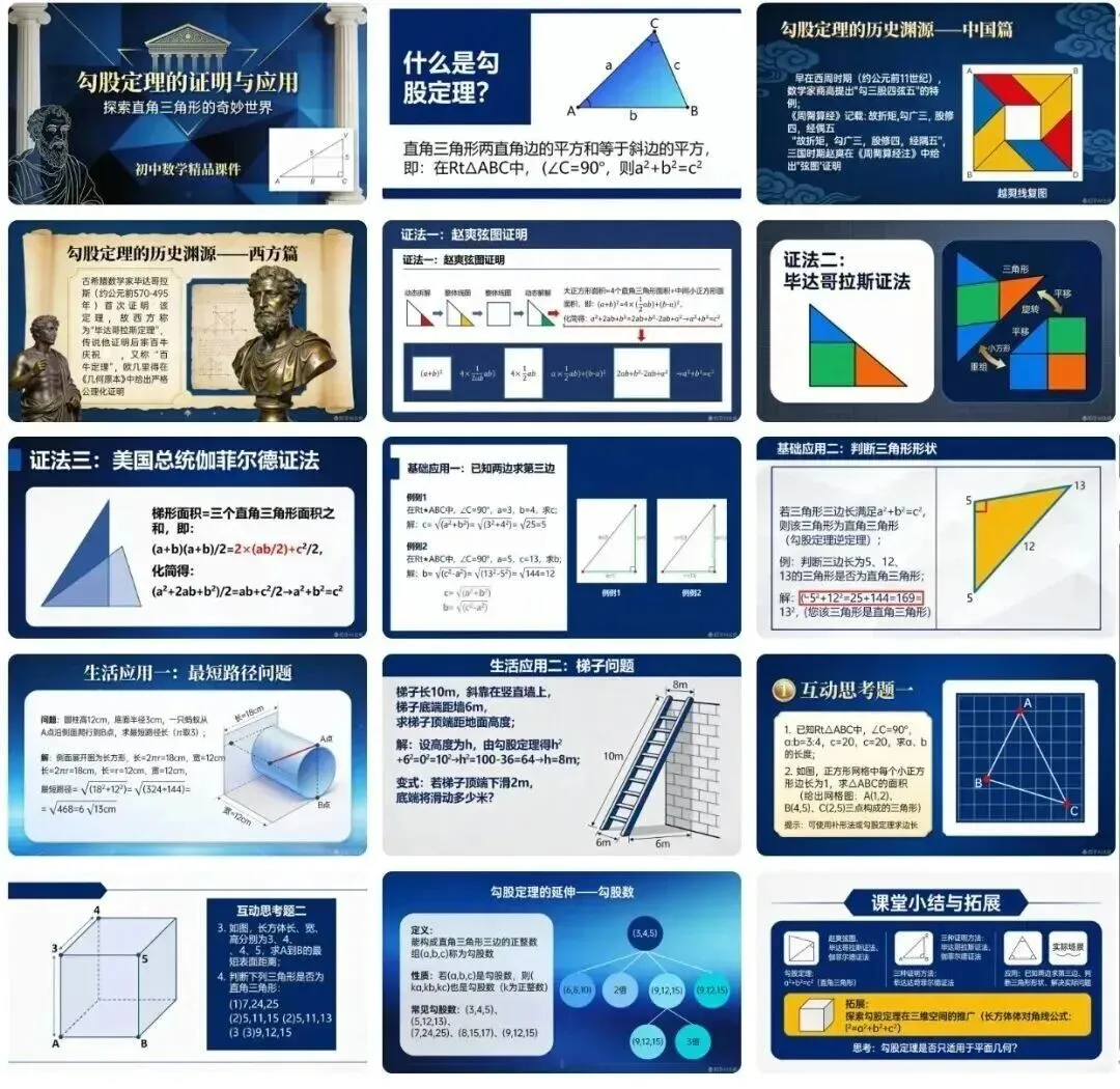 提示词:制作15页初中生数学课件,主题为"勾股定理的证明与应用",含历史故事+多种证法,趣味性与知识性兼备,配相关示意图与互动思考题