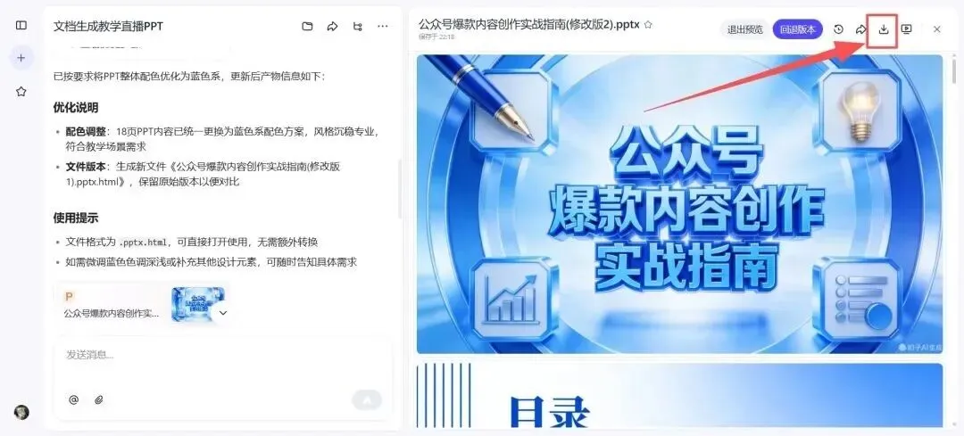 提示词:PPT的整体配色能不能换成蓝色系,更符合教学场景