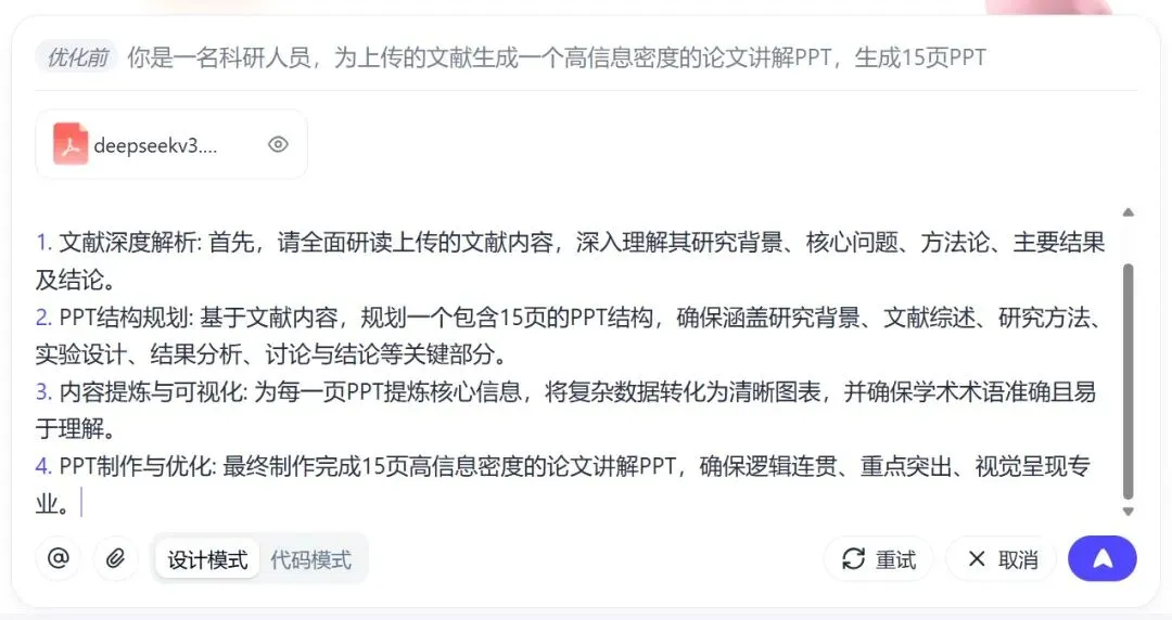 论文、报告、手册……上传给它,它就能快速消化,自动提炼重点,做成结构清晰的PPT。