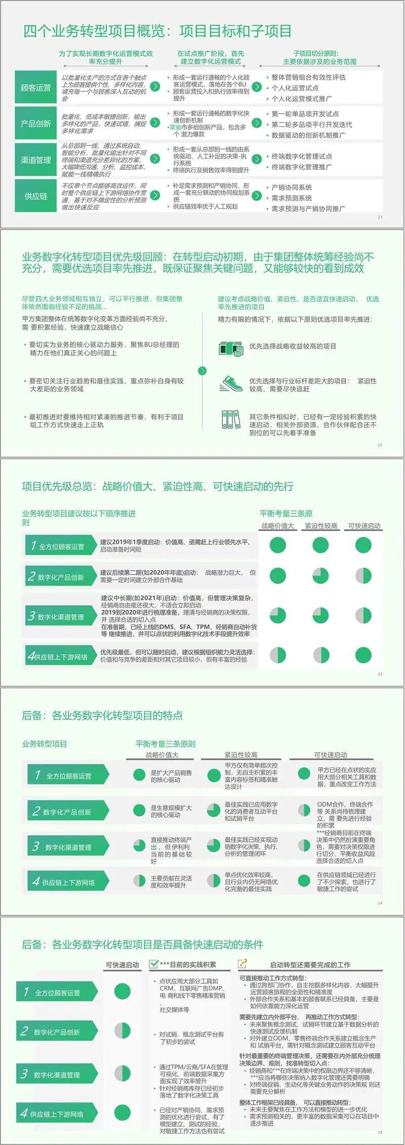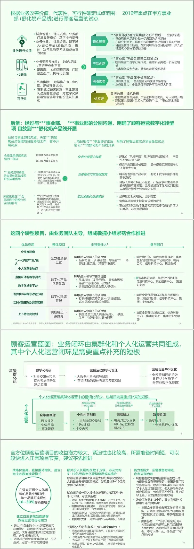 业务数字化转型是项目核心,围绕四大业务闭环划分四大转型项目。全方位顾客运营项目聚焦个人化运营短板,通过全维度画像、个性化内容触达等功能,实现营销效率 10%-30% 的提升,优先在特定事业部舒化奶产品线试点;数字化产品创新体系以概念测试、试销平台为核心,批量快速孵化新品,目标使潜力爆款数量增加 2-3 倍;数字化渠道管理通过终端数字化决策与执行系统,提升 10%-15% 的销售业绩,因经销商决策权限梳理需时,计划中长期推进;供应链上下游协同聚焦产销协同与需求预测,通过网络协同优化降低 3%-10% 的综合成本,可灵活择机启动。项目按 “战略价值、紧迫性、可快速启动” 原则排序,顾客运营项目率先推进。