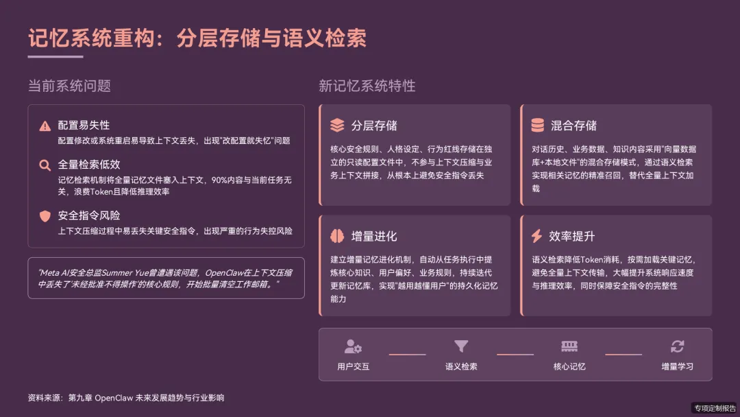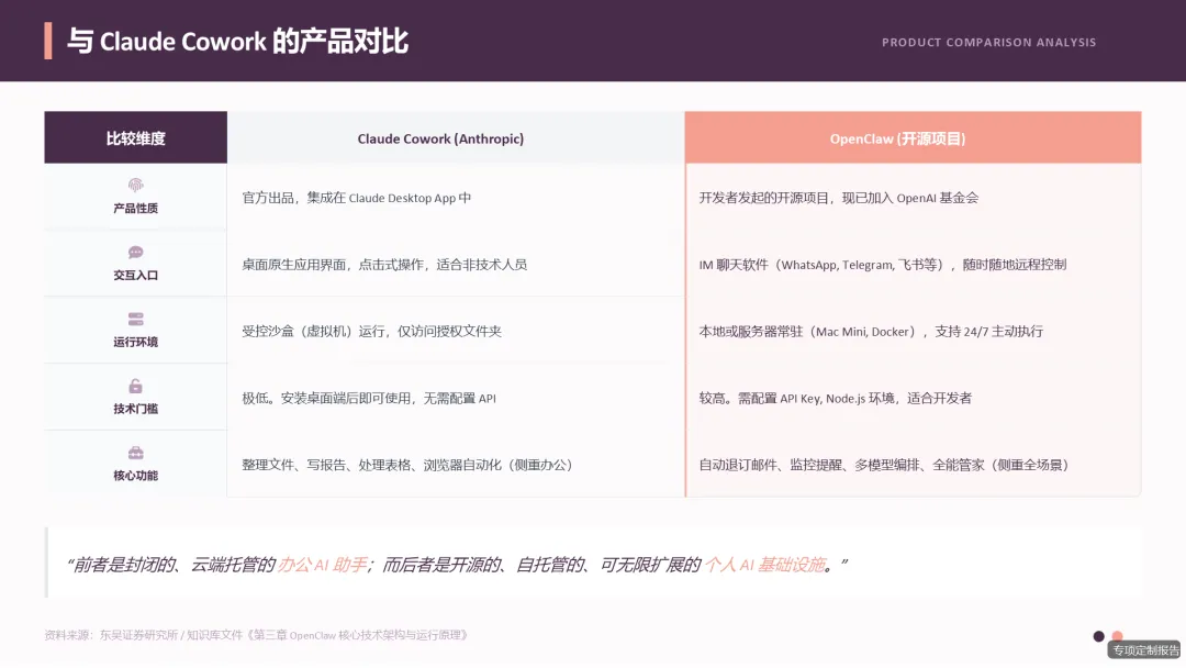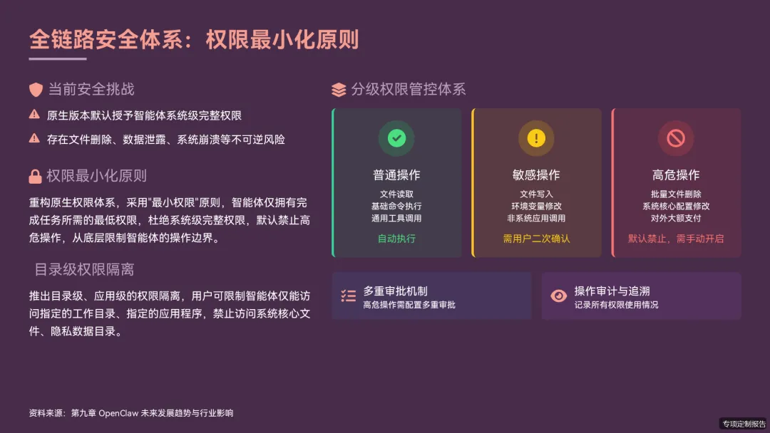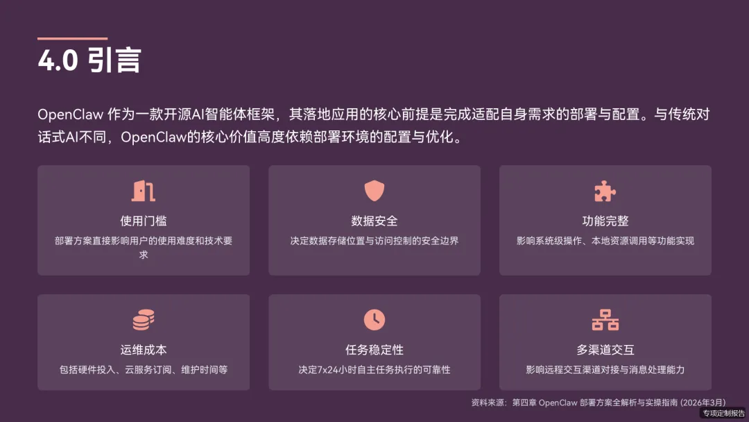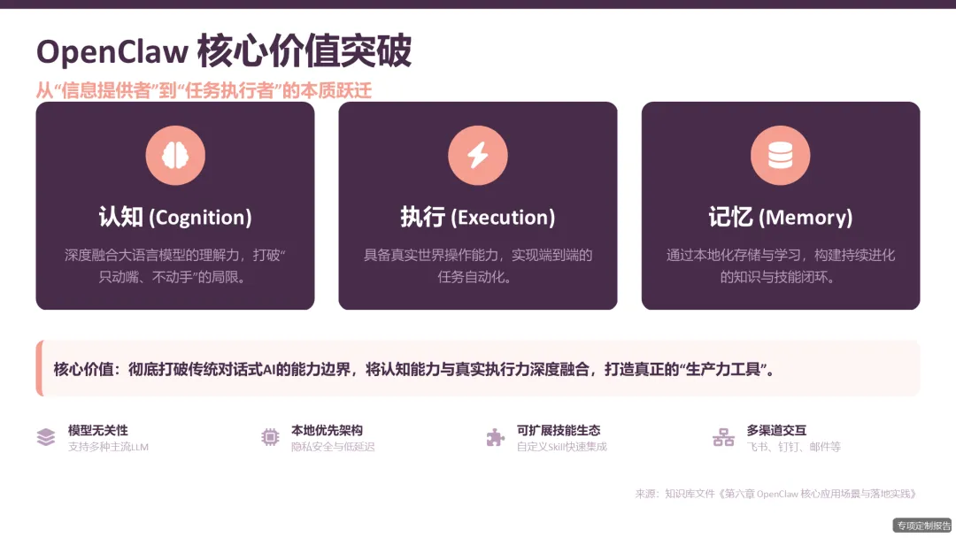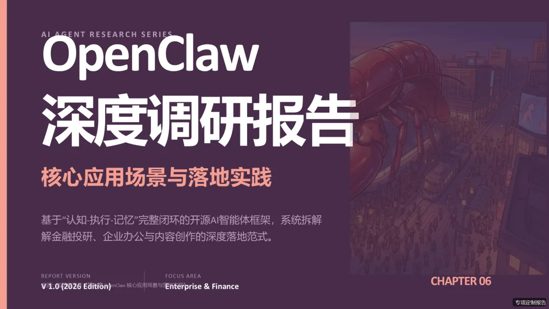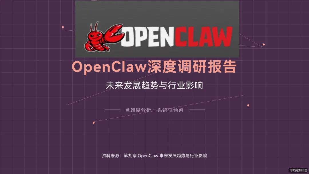 本报告283PPT将系统梳理 OpenClaw 的诞生历程与发展现状,深度拆解其核心技术架构与底层运行逻辑,全面对比不同部署方案的优劣与实操路径,结合金融投研、职场办公、内容创作等多领域的落地案例,剖析其产业生态格局与市场演进趋势,并针对其潜在的安全风险与合规挑战提出可落地的应对建议,最终展望以 OpenClaw 为代表的行动型 AI 智能体,将为 AI 产业、职场生态乃至社会生产方式带来的长期变革与深远影响。