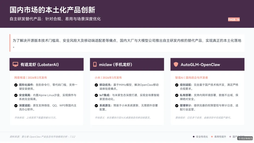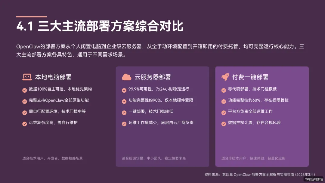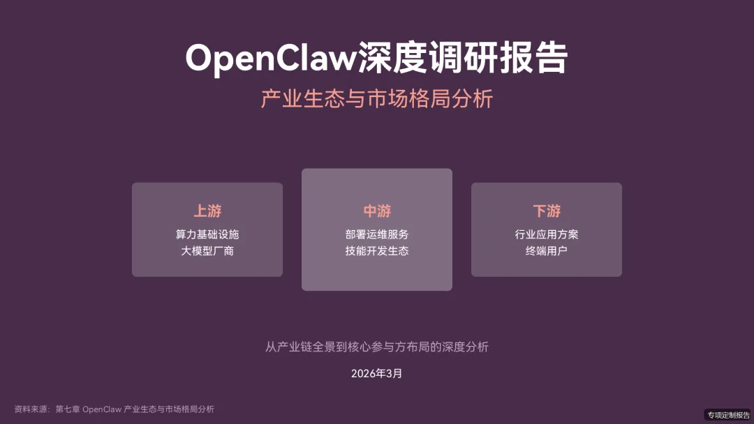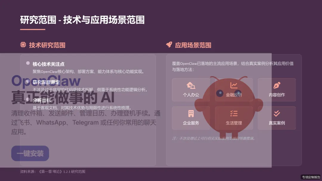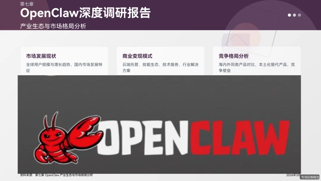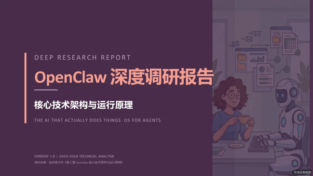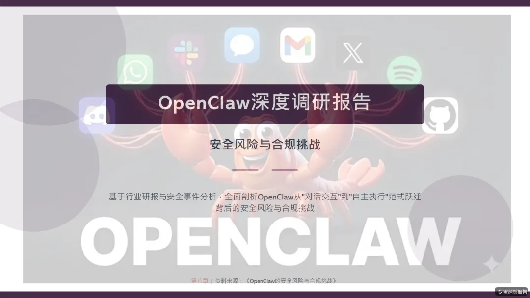 本报告283PPT将系统梳理 OpenClaw 的诞生历程与发展现状,深度拆解其核心技术架构与底层运行逻辑,全面对比不同部署方案的优劣与实操路径,结合金融投研、职场办公、内容创作等多领域的落地案例,剖析其产业生态格局与市场演进趋势,并针对其潜在的安全风险与合规挑战提出可落地的应对建议,最终展望以 OpenClaw 为代表的行动型 AI 智能体,将为 AI 产业、职场生态乃至社会生产方式带来的长期变革与深远影响。