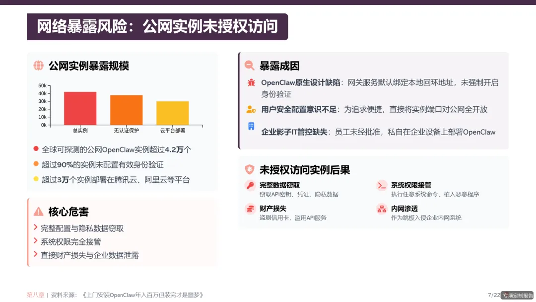 但在全民狂欢的背后,我们必须清醒地看到,作为一款仍处于快速迭代期的开源项目,OpenClaw 在带来生产力革命的同时,也伴随着不可忽视的风险与挑战。Meta AI 安全总监因 OpenClaw 指令偏差清空工作邮箱的案例、社区超 12% 的第三方技能包存在恶意代码的事实、超 4.2 万个公网暴露实例中九成以上可被绕过验证的安全现状,都在提醒我们:在拥抱技术变革的同时,更需理性审视其背后的权限边界、数据隐私与生态治理难题。