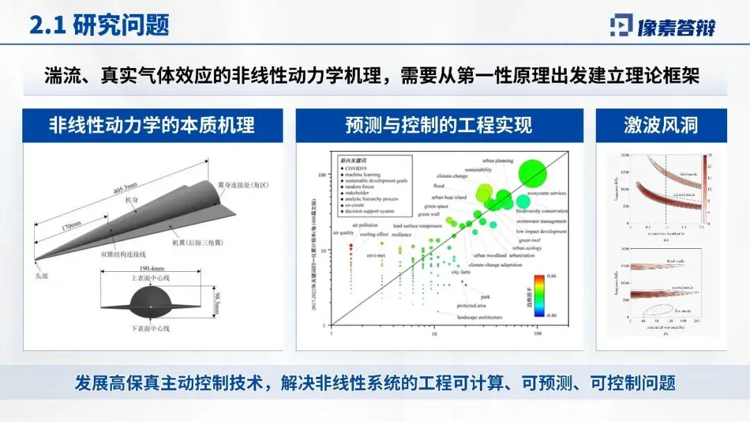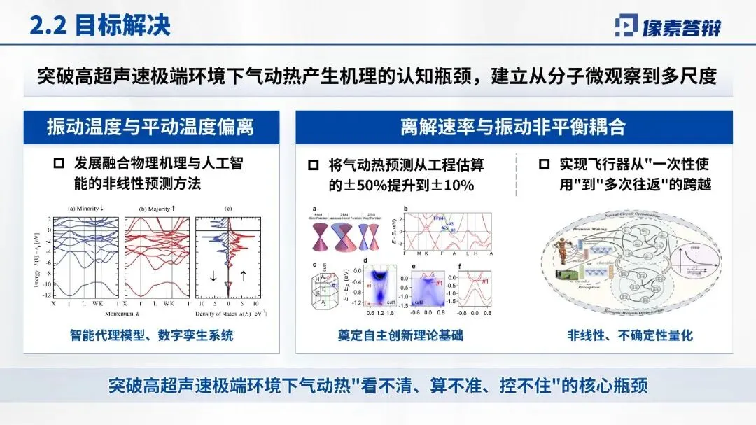 PPT按“背景—问题—创新—应用”主线展开。背景从大国博弈战略高度切入,强调气动热预测控制的紧迫性;卡脖子问题直指热流预测偏差大、转捩预测难、通信中断三大痛点;研究内容涵盖多尺度建模、物理信息嵌入神经网络、智能热防护等前沿方向;应用推广依托国家数值风洞工程,向全国航空航天研制单位辐射。整体逻辑清晰,问题导向明确,技术路径完整,但部分创新点的量化指标可进一步细化。
