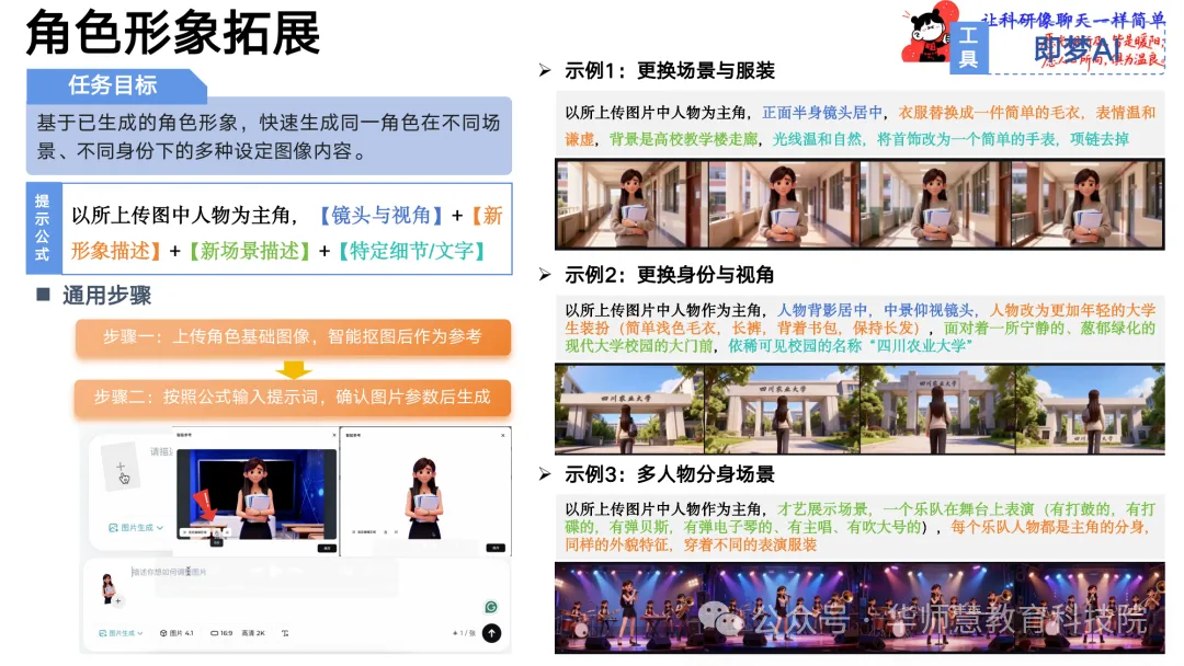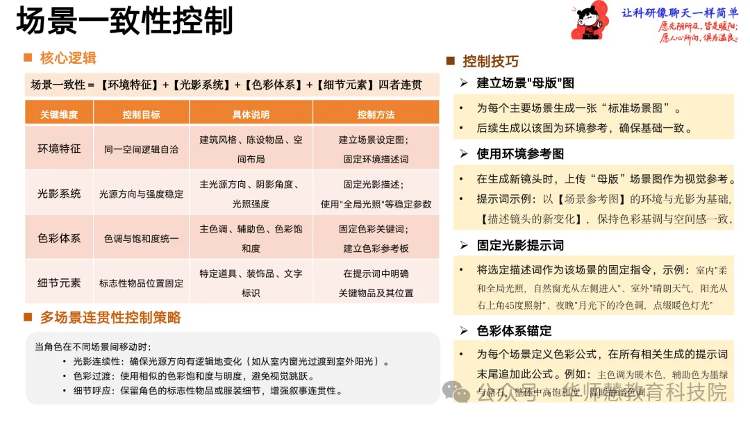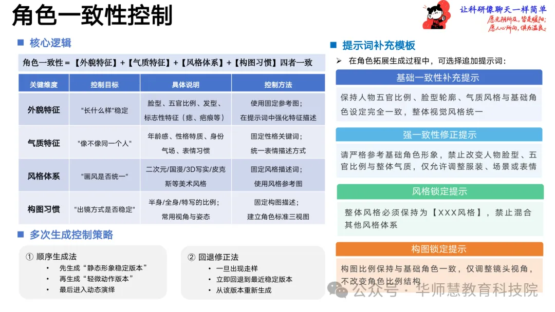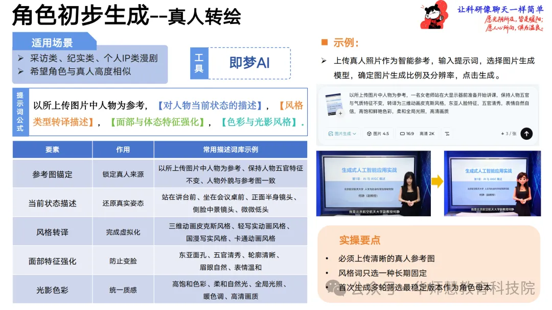 在角色创作板块,手册提供从基础设定、真人转绘到风格化构建的“核心提示词公式”,辅以即梦AI等工具的具体操作步骤与示例,指导创作者快速生成稳定可复用的角色形象,并通过智能抠图与场景拓展实现多身份、多环境的形象延伸。一致性控制模块从角色、场景、风格三维度建立控制逻辑与多生成策略,配套强一致性修正、风格锁定、构图锁定等提示词模板,确保跨工具、跨镜头的视觉统一。